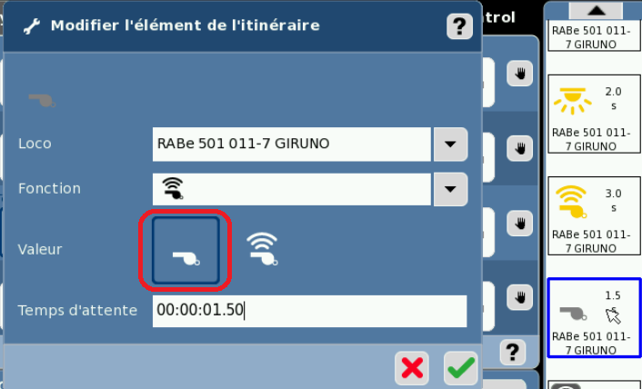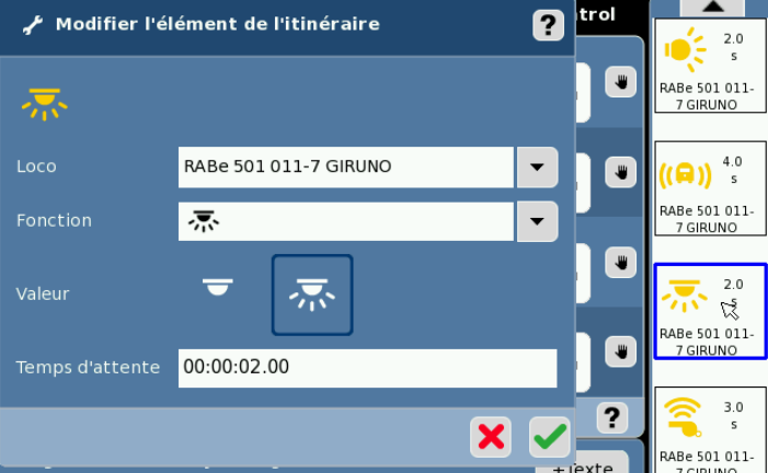 Sur l’exemple ci-dessus, j’ai choisi le RABe 501 011-7 GIRUNO et y ai activé dans l’ordre les fonctions suivantes: