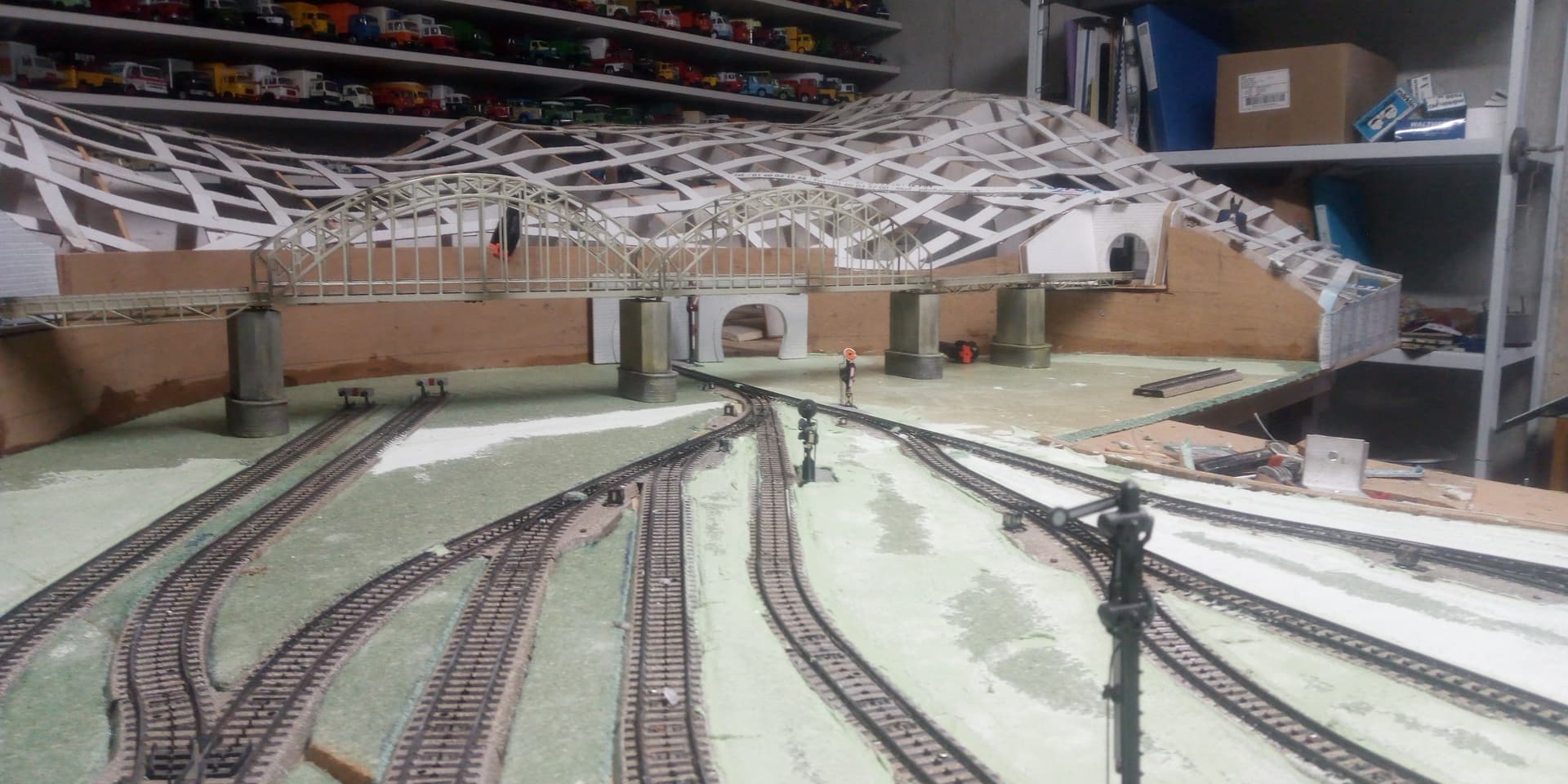 J’ai cinq secteurs donc cinq transfos , et j’ai une voie unique qui part du dépot, va sous le plateau et reviens en passant sur le pont pour redescendre et rentrer au dêpot. Et il y a une petite gare caché avec trois voies de garage en niveau moins un.