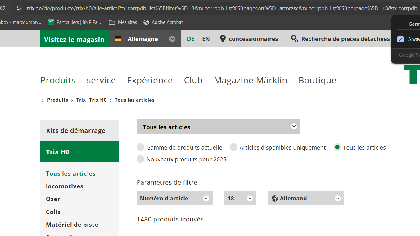 Si tu vas sur Trix.de, tu peux accéder à leur base de produits, comme Märklin (même motif, même punition). Il faut sélectionner “tous les articles”