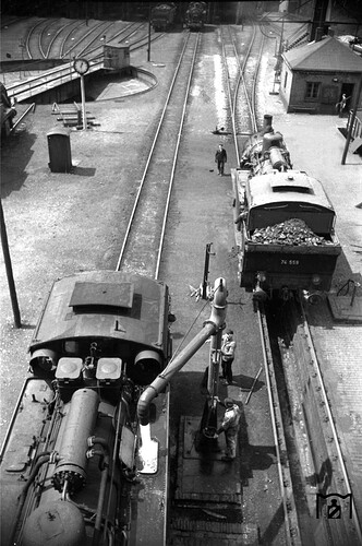 Cependant… d’une, je connais un certain nombre de photos de la T12 à tous les âges, et je n’en connais aucune avec des traces de calcaire sur le flanc de la soute à eau. Le rebord est assez haut, si jamais ça déborde, ça s’écoule plus vers le devant… voici une photo de 1952 (les machines ne sont plus très jeunes) :