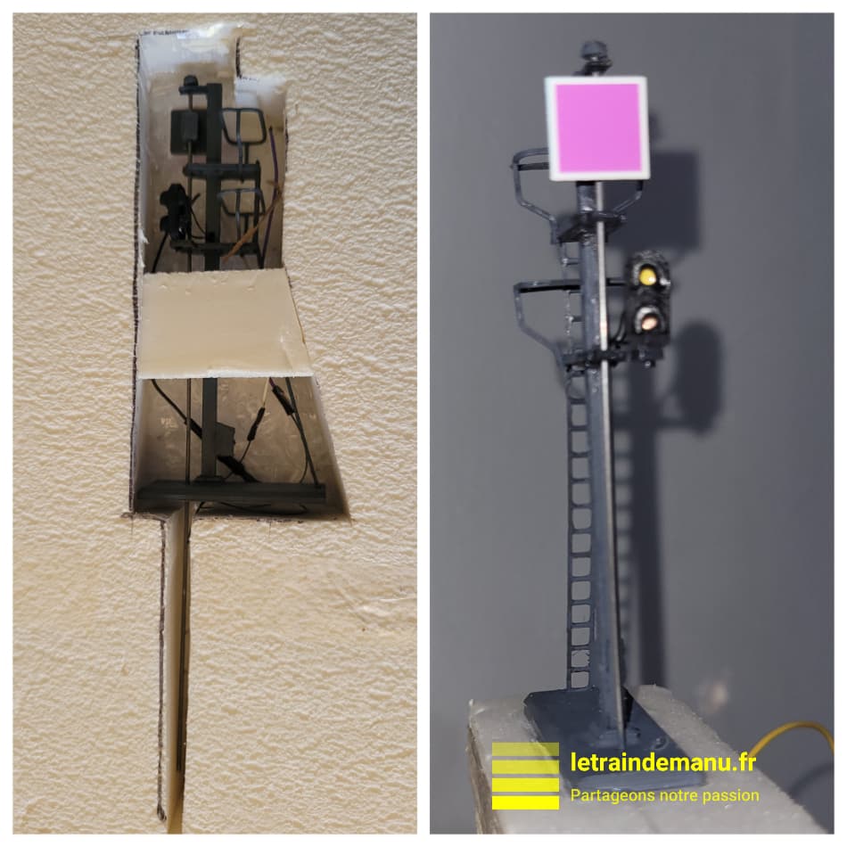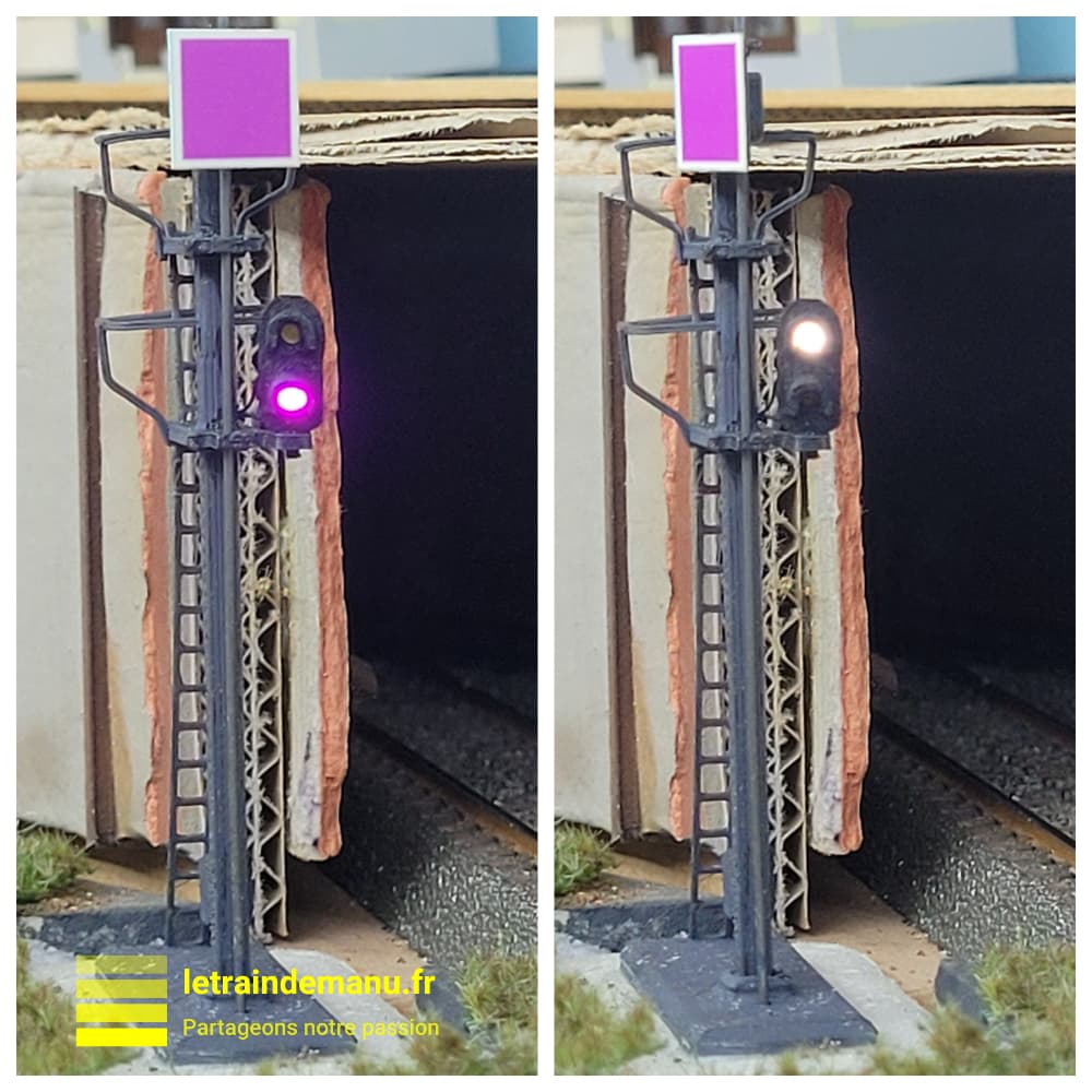 J’ai donc acquis un carré violet auprès de ce fournisseur. Livré parfaitement calé dans un emballage de polystyrène, le signal est vraiment joli. Il est réalisé en impression 3D à base d’acide polylactique. Les feux à leds sont pré câblés avec résistance soit au commun négatif soit au commun positif (à préciser à la commande ainsi que la couleur du mât). La cible est montée sur un axe en corde à piano qui dépasse largement sous le signal pour sa motorisation sous table.
