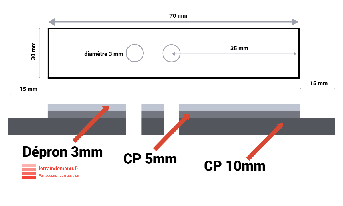 Sur la face inférieure, je colle une plaque de contreplaqué 10mm de même largeur 30mm, mais plus longue de 15 mm à chaque extrémité. En effet, le signal sera installé ultérieurement par le dessous. La surlongueur de 15mm permettra sa fixation par vissage. Ainsi, le signal sera démontable facilement en cas d’intervention ultérieure sur la mécanique.