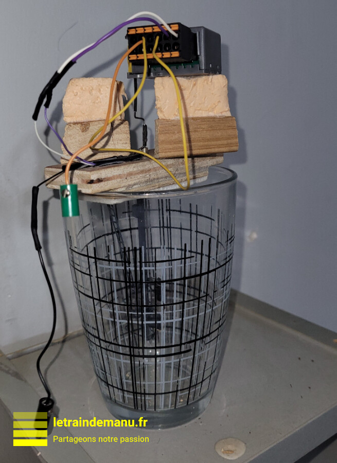 On place ensuite ce montage, à l’envers, dans un verre à soft, de 7 à 8 cm de diamètre intérieur et de 12 cm de profondeur. C’est le moyen que j’ai trouvé pour travailler sous le signal sans risquer de le détériorer.