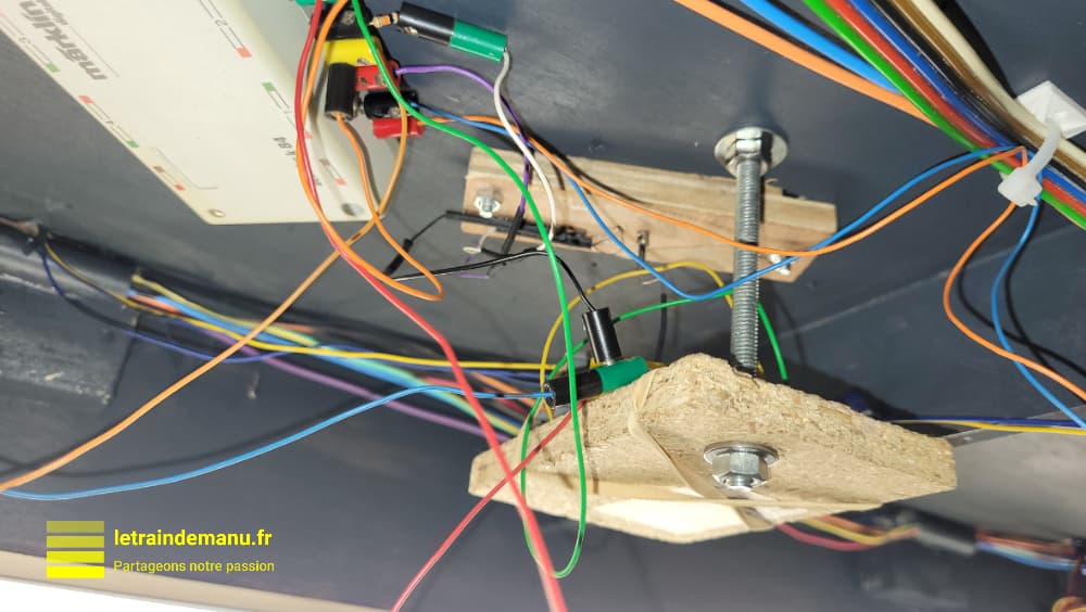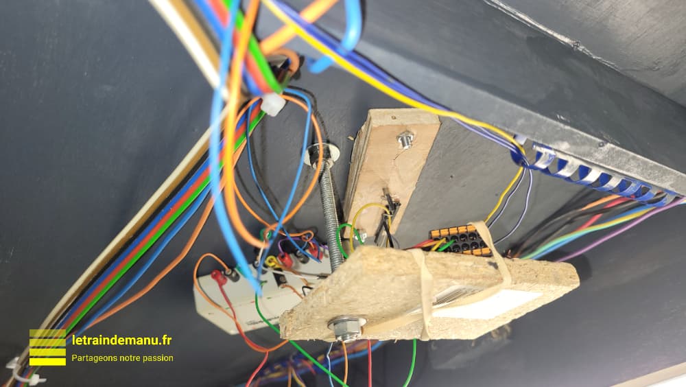 Photo 3798 : Installation de la motorisation du carré violet mécanique vue du dessous du réseau. Source : letraindemanu.fr