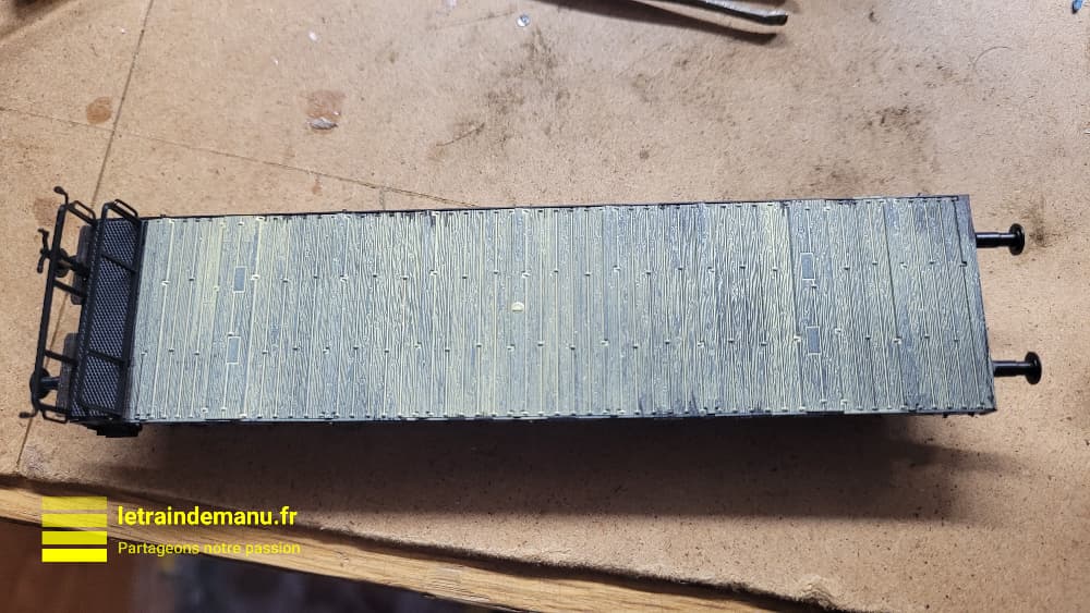 La surface du plancher a été traitée de la même façon que les wagons plats de ma rame de travaux, avec un crème Humbrol 103 à peine dilué.