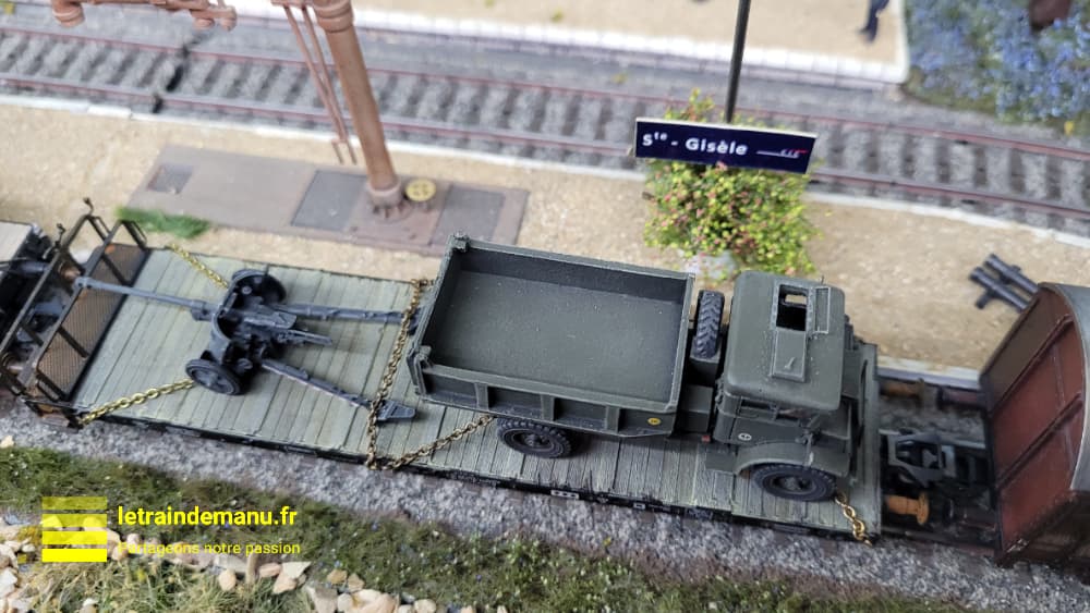 Photo 3843 : Le wagon plat pour charges lourdes Rlyf SNCF Fleischmann référence 5285 F1 avec son chargement : un Chevrolet 3T REE AB-021 et un canon anti-char de 50mm Artitec 6870498. Crédit : letraindemanu.fr