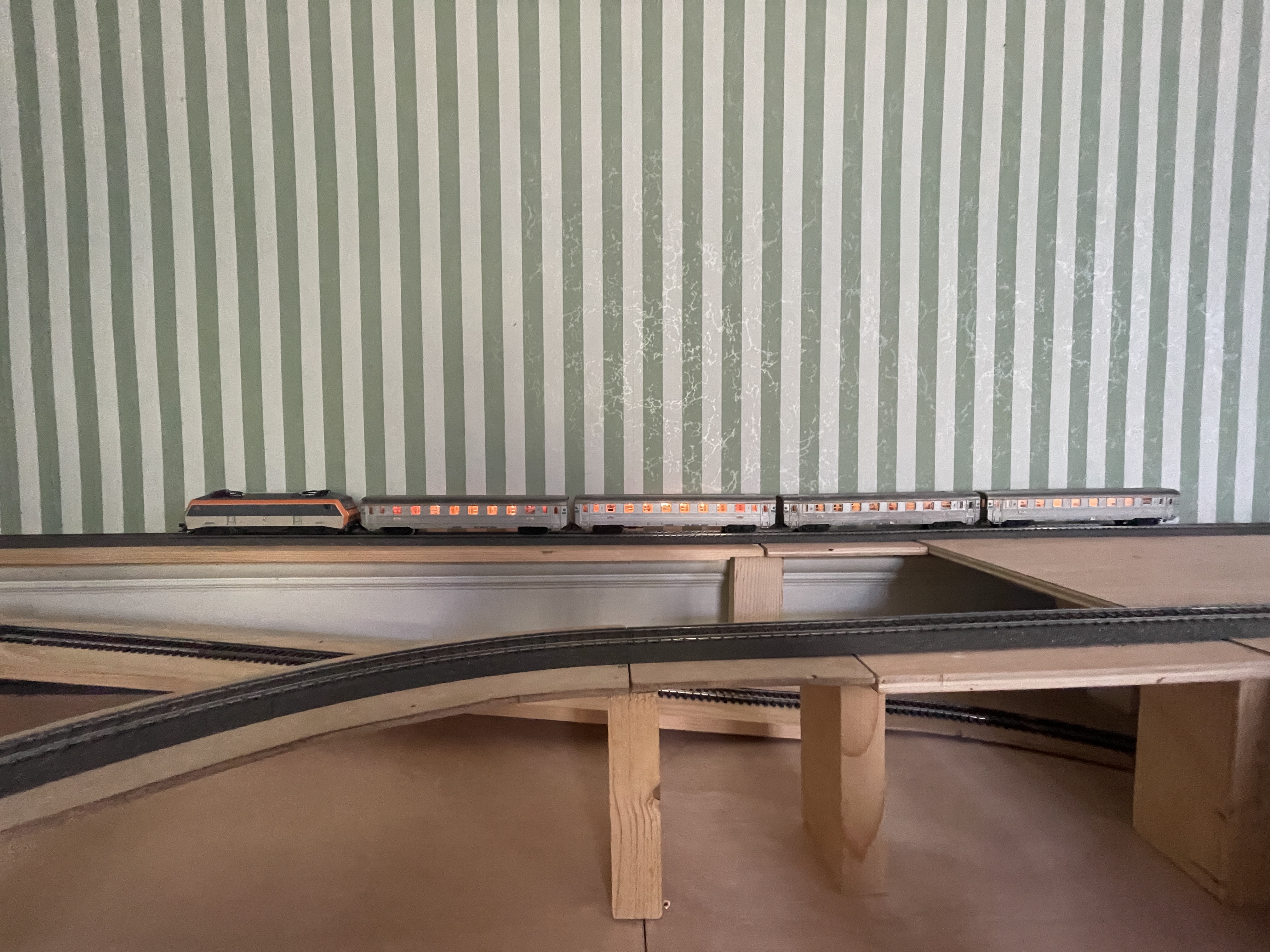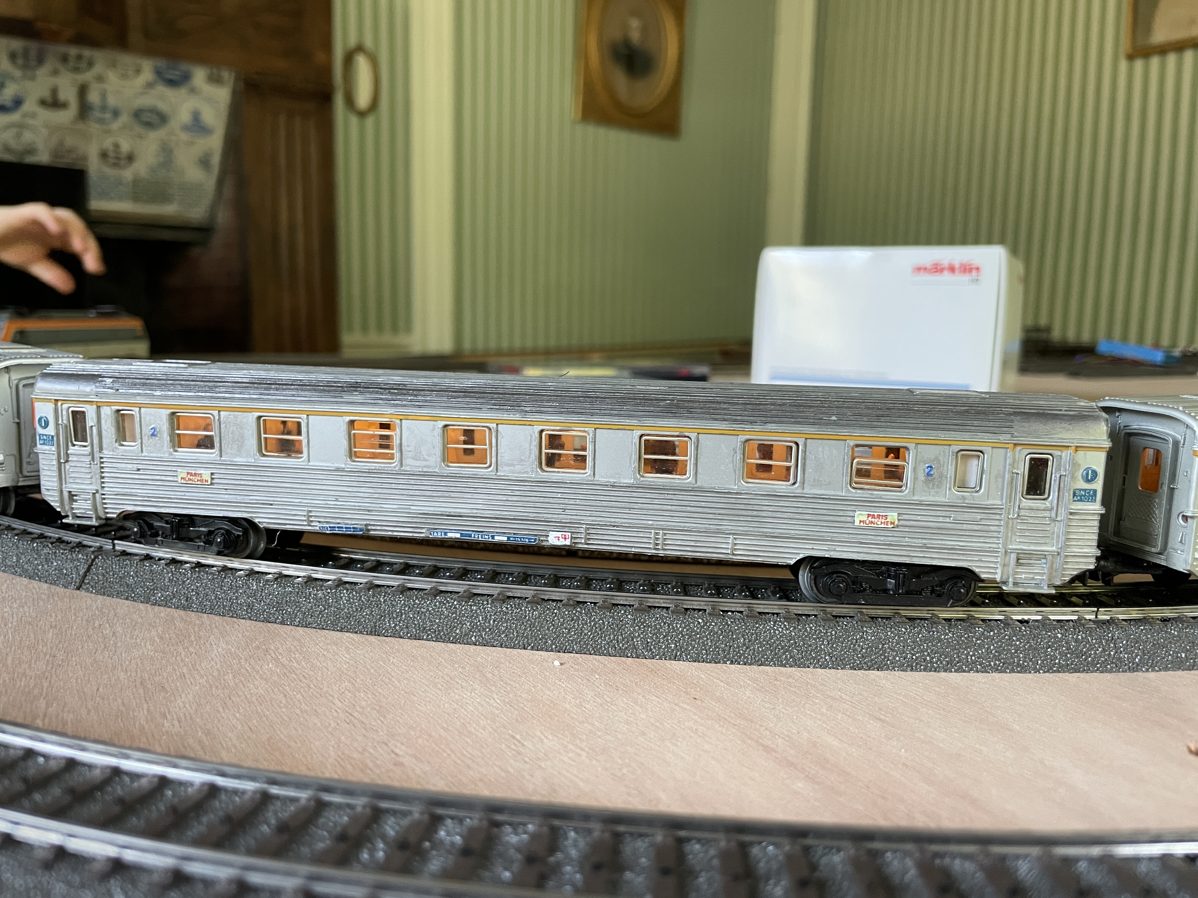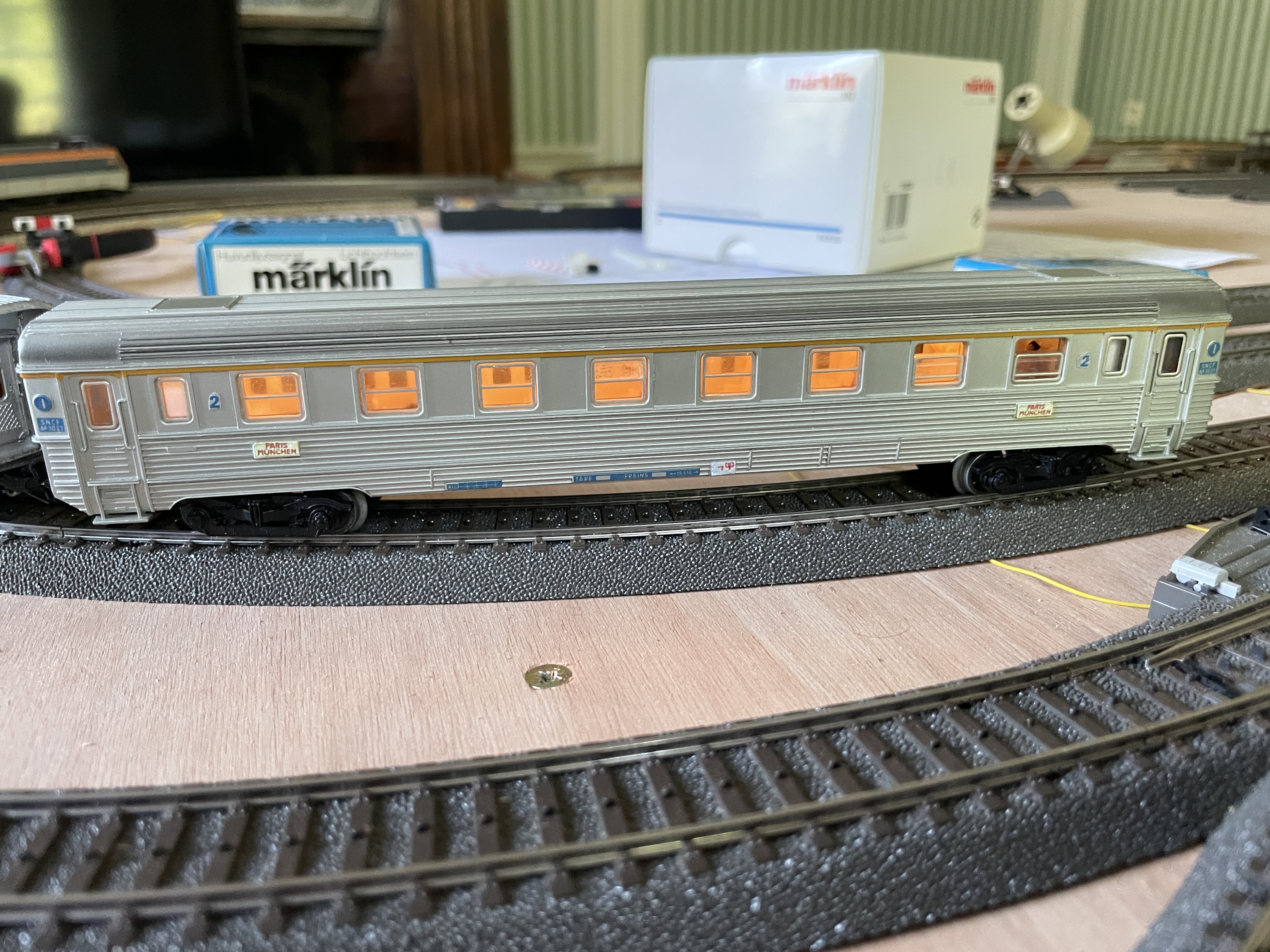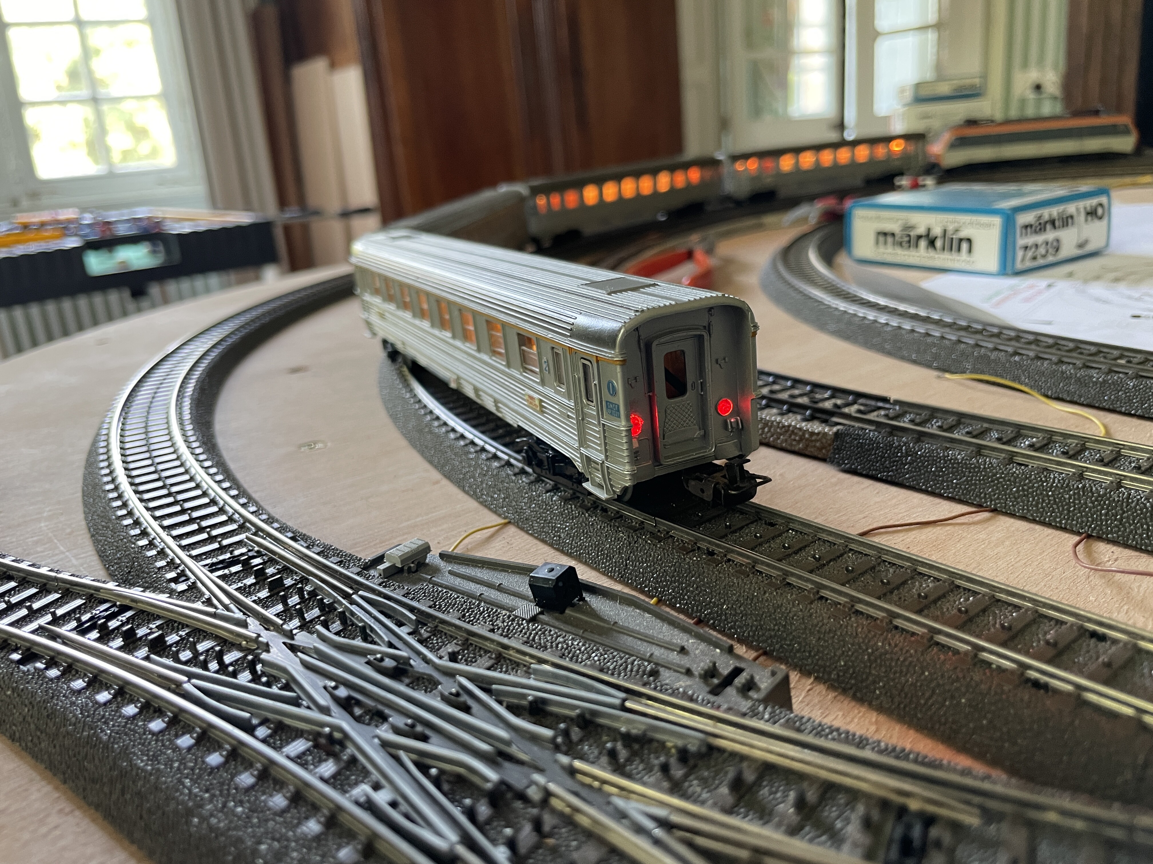 Les vacances sont finies et je n’ai malheureusement pas de photos à partager de l’avancement du circuit. Outre la rame inox montrée ci-dessus, je n’ai fait que continuer à électrifier la gare cachée et ce n’est pas fini. Comme je me suis trompé de décodeur Switchpilot d’ESU, il reste encore 3 aiguilles non raccordées à la CS1… J’espère que cela sera bon à la Toussaint si je parviens à acheter le bon décodeur.
