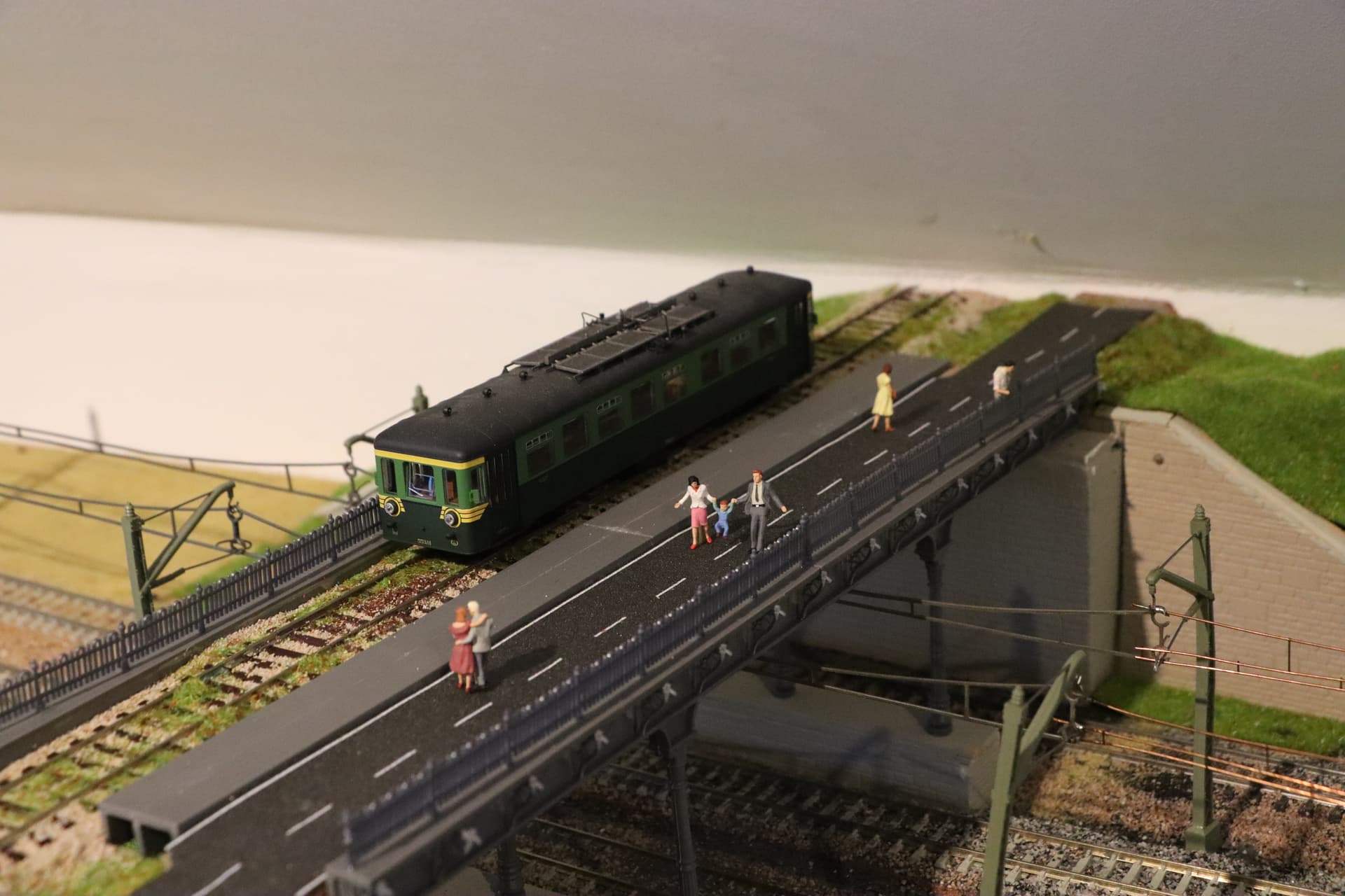 Le pont vient de chez Faller, l’autorail de chez Piko, les promeneurs de Preiser et la route est une référence Noch pour l’échelle N. On attend tellement de trafic piéton et cycliste que la région a fait peindre des bandes de circulation .