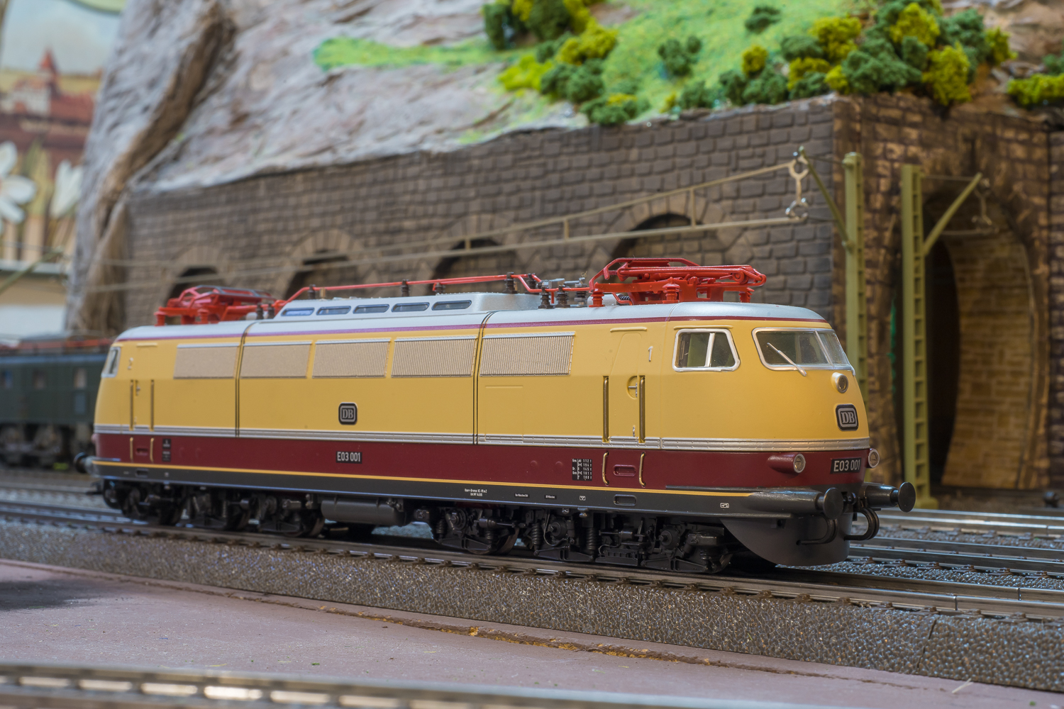 Légèrement plus âgée du fait de ses 3 feux au lieu des 5 plus modernes de celle du dessus, cette E41 de livrée bleue ne possède pas les attelages conducteurs mais une cabine éclairée et un mécanicien aux commandes.