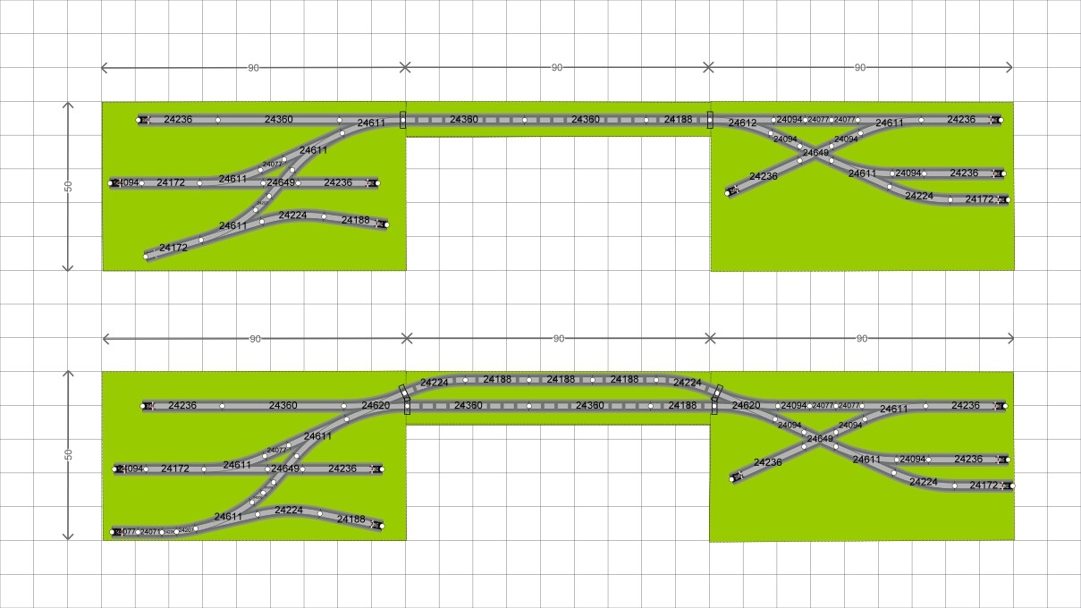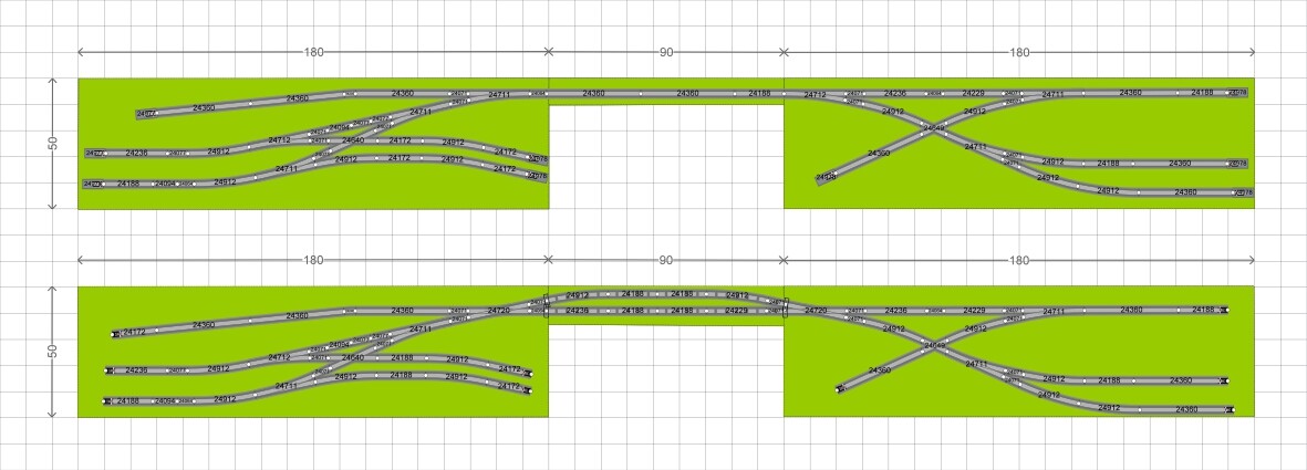Le premier plan ne comporte qu’une voie cachée derrière la partie biblio et le second présente une variante de mon cru avec une voie d’évitement, permettant à 2 petits convois de se croiser et de se garer.