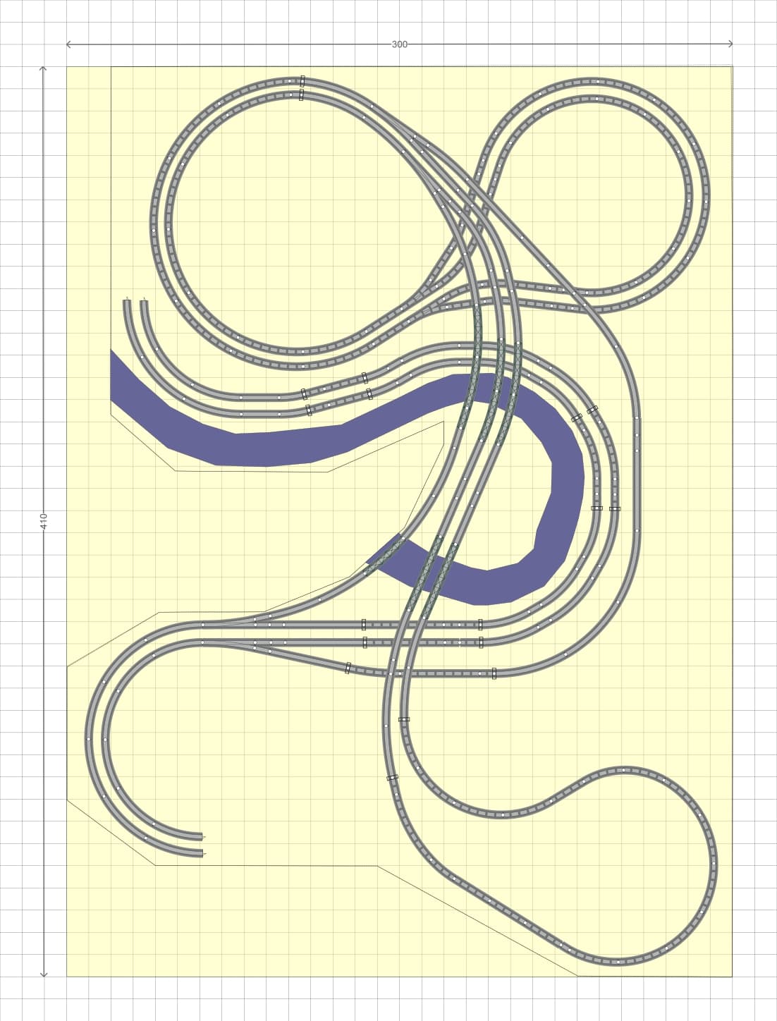 J’ai réussi à garder les dimensions originales de 300 x 390 cm. Les pentes sont de moins de 3% et les hauteurs libres sous les ponts sont d’au moins 8,5 cm. Je n’ai pas dessiné de gare cachée mais cela ne devrait pas poser de challenge, il y a de la place en sous-sol.