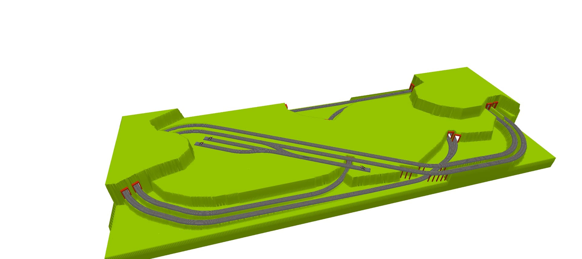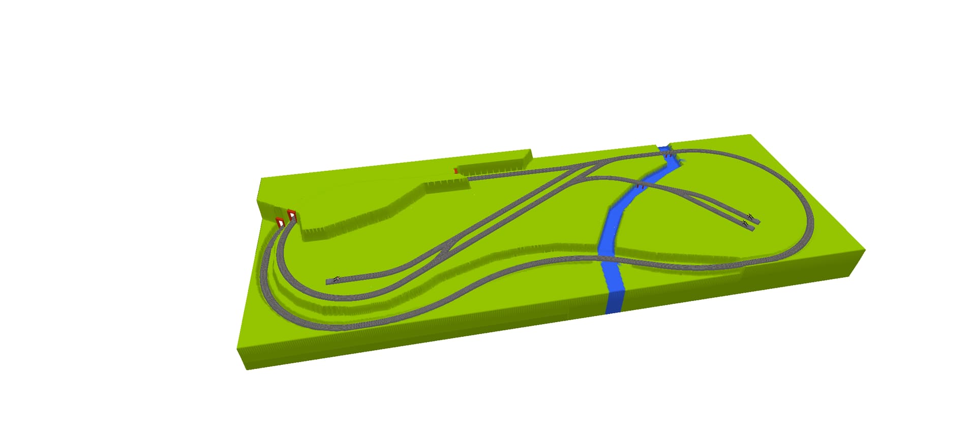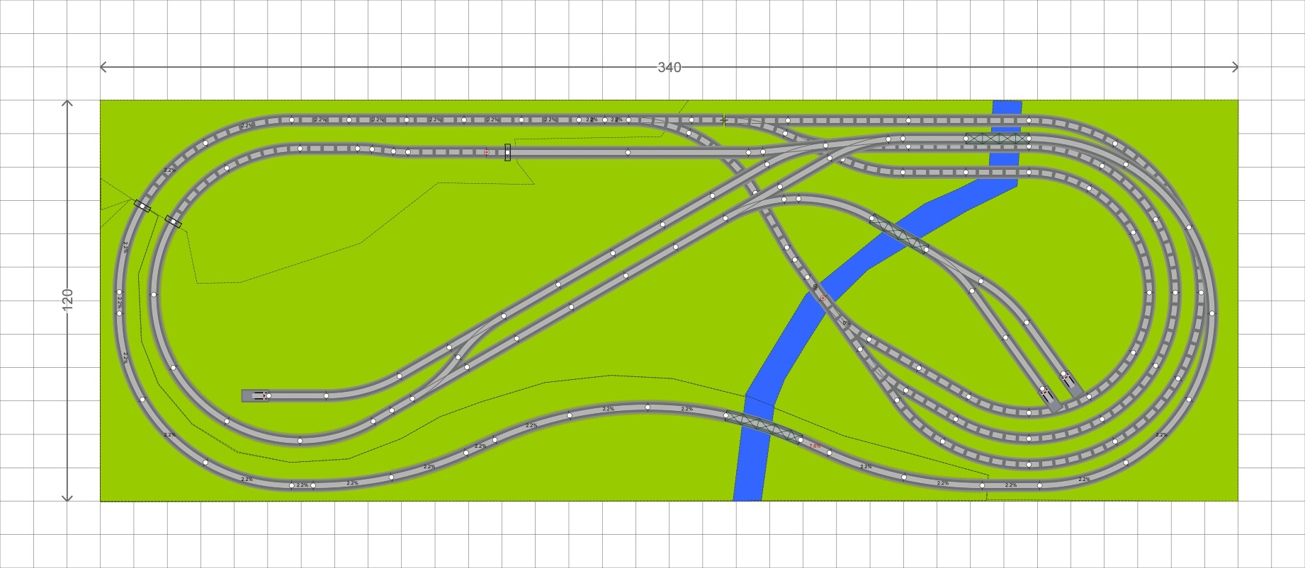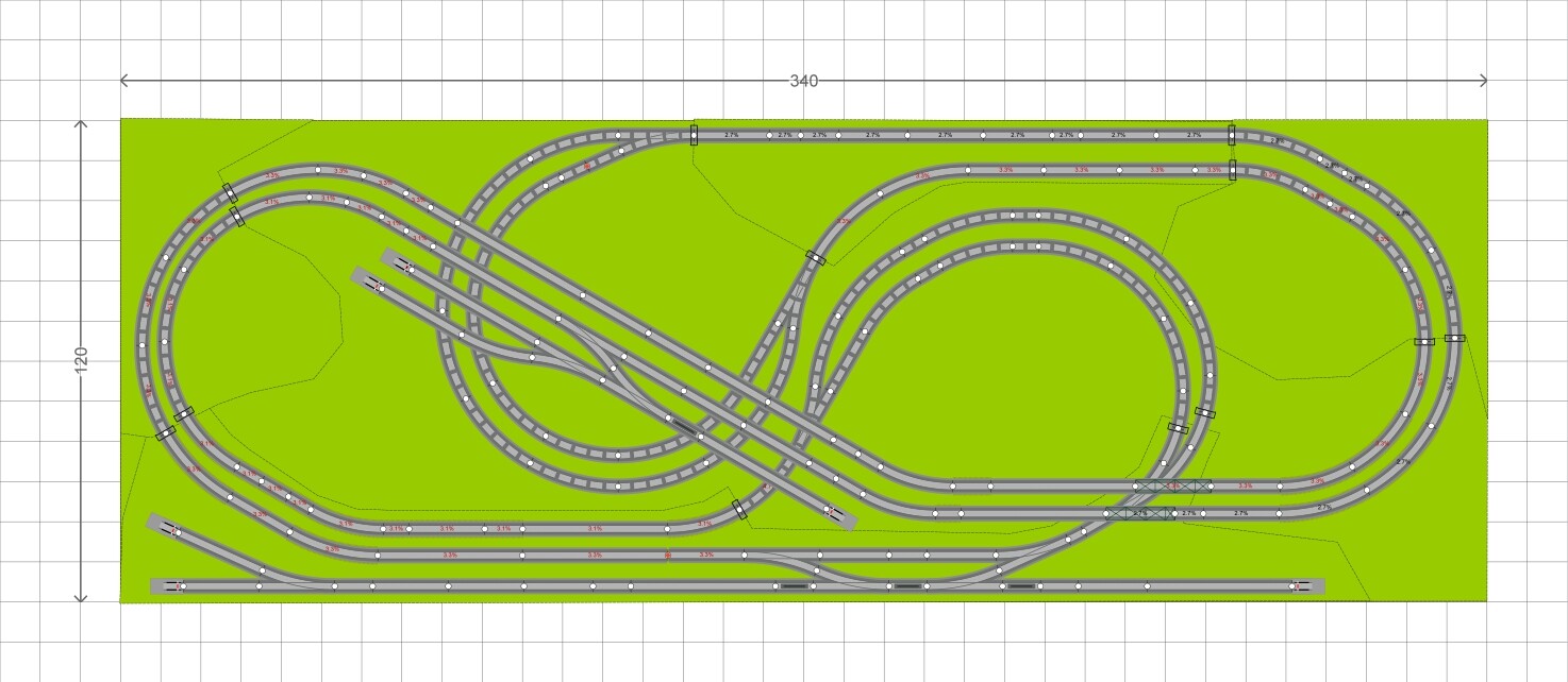 Voici une première variante qui sert ton envie de décor et de voir un train passer dedans comme tu l’as exprimé dans un de tes posts. Ce réseau est en fait un ovale replié sur une gare cachée de 3 voies. Un epetite gare/halte de campagne se trouve sur le niveau 0 et tu as une longue voie de parade sur l’avant du réseau qui relie les 2 niveaux. La sortie de la gare redescend plus fortement vers la gare cachée, pentes de 2,1% pour la voie de parade et 3,2% pour l’autre. La hauteur libre est de 12 cm (en réalité 11 puisqu’il faut soustraire la plateforme de voie du niveau 0.