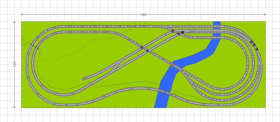 Je t’en propose une plus complète, le réseau du modéliste Suédois, aggrandi aux dimensions de ton réseau et avec 2 voies de garage/croisement de chaque côté de l’“os-de-chien”. Celui-ci permet quelques manoeuvres avec les petites voie de débord sur l’avant du réseau? mais on peut facilement les retirer en faire une voie de parade plus sophistiquée.