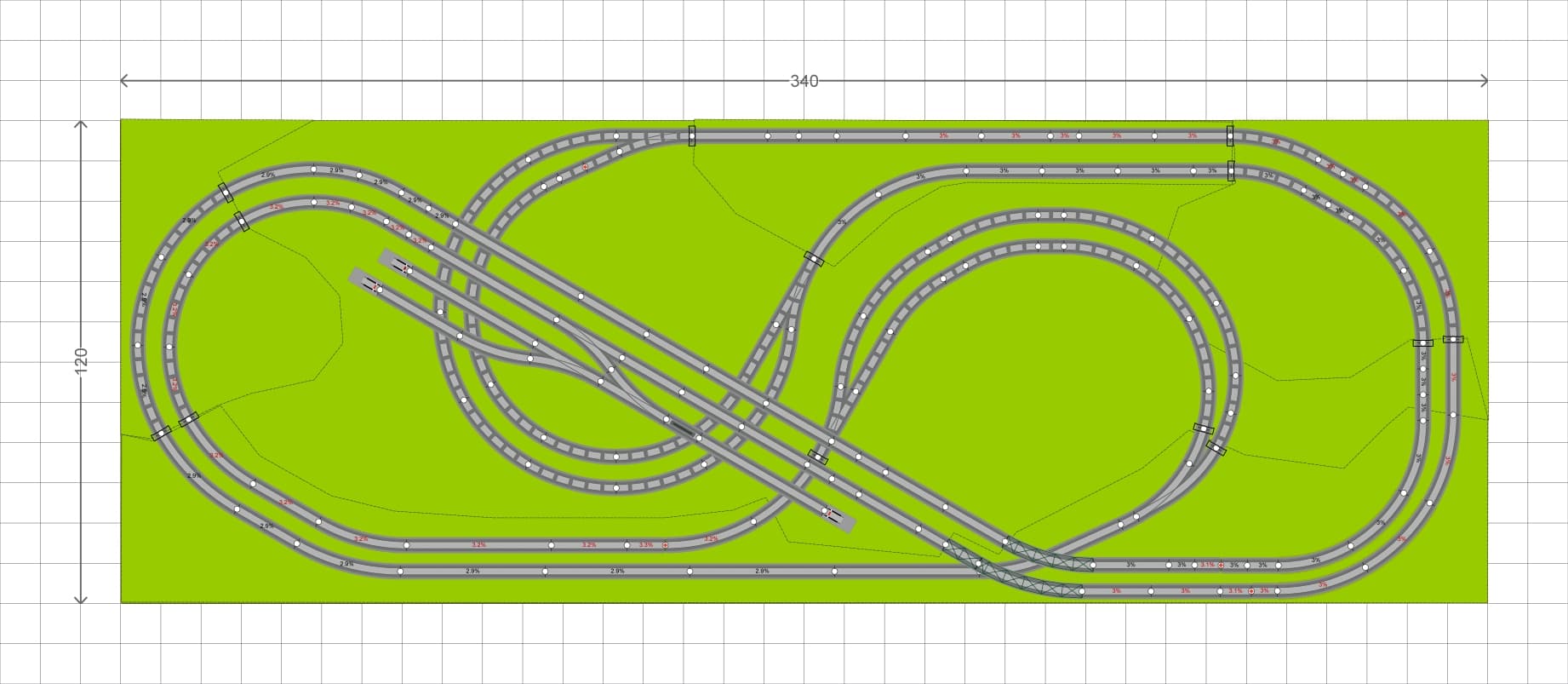Mon réseau fait 400 cm*170 cm et il y a 3 niveaux. Les pentes sont de 3% et j’ai 12 cm de haut (Caténaires).