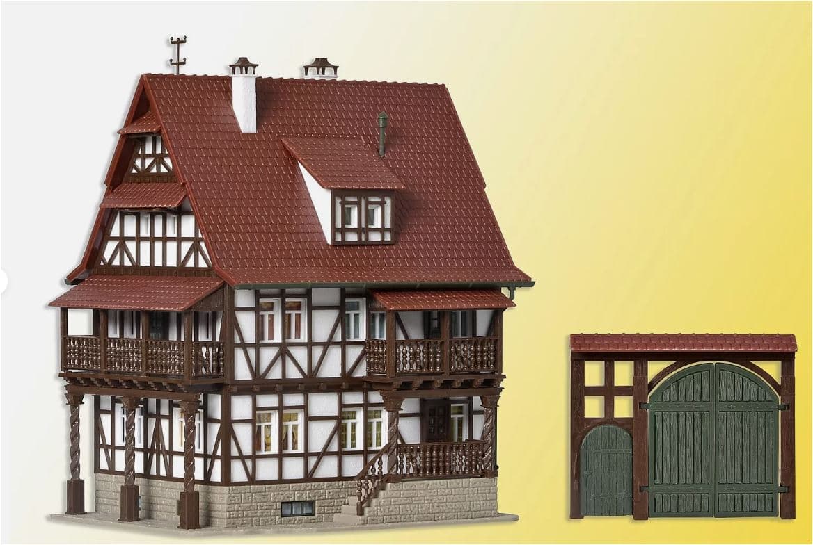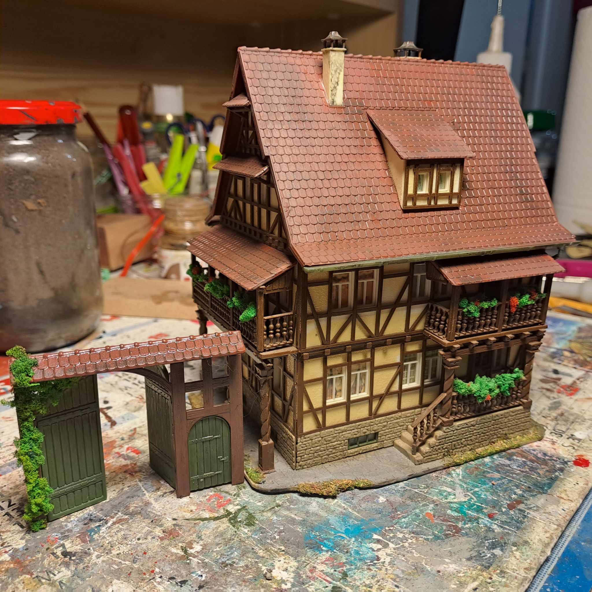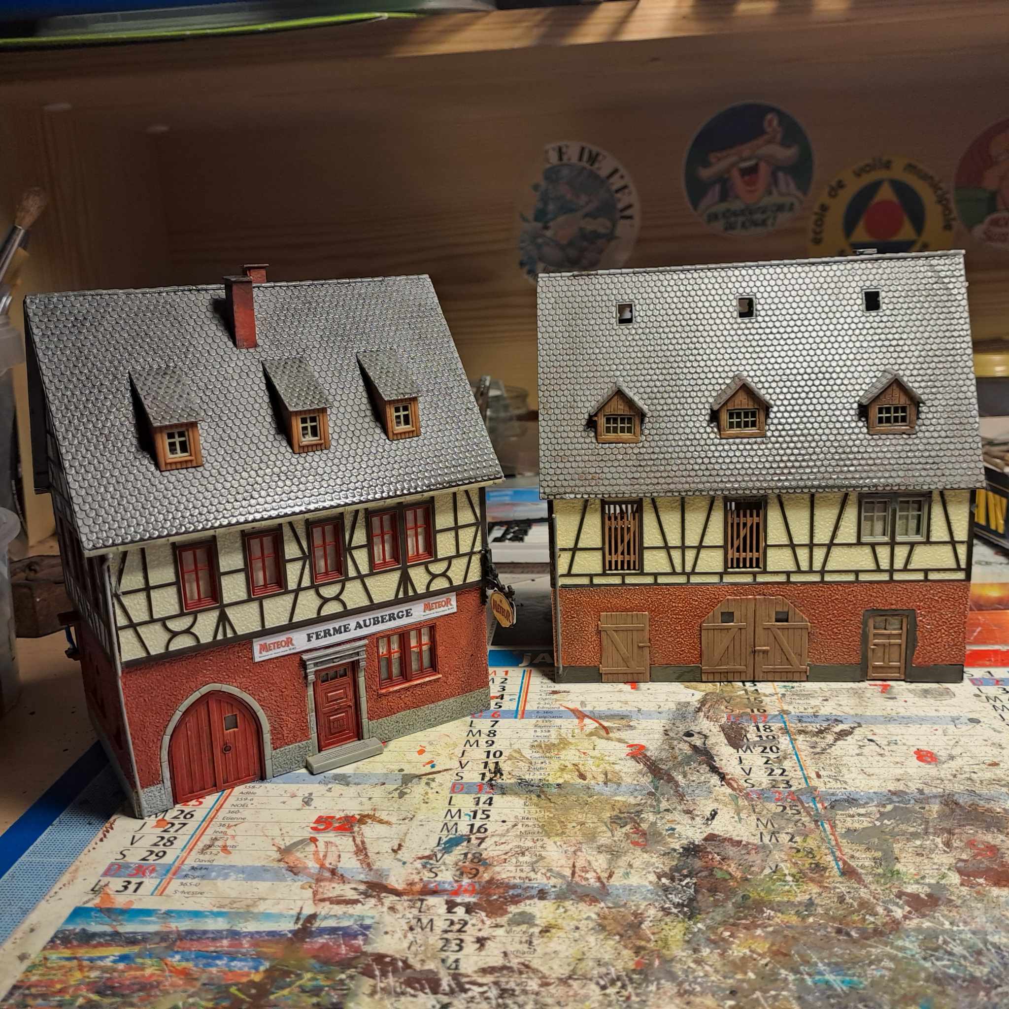 Reprise complète de la peinture de la grange Faller B-353 donnée par vincentlj au cours d’un de ses passages pour être en cohérence avec la ferme auberge. Et amélioration de la patine du toit de la ferme auberge Faller pour être raccord.