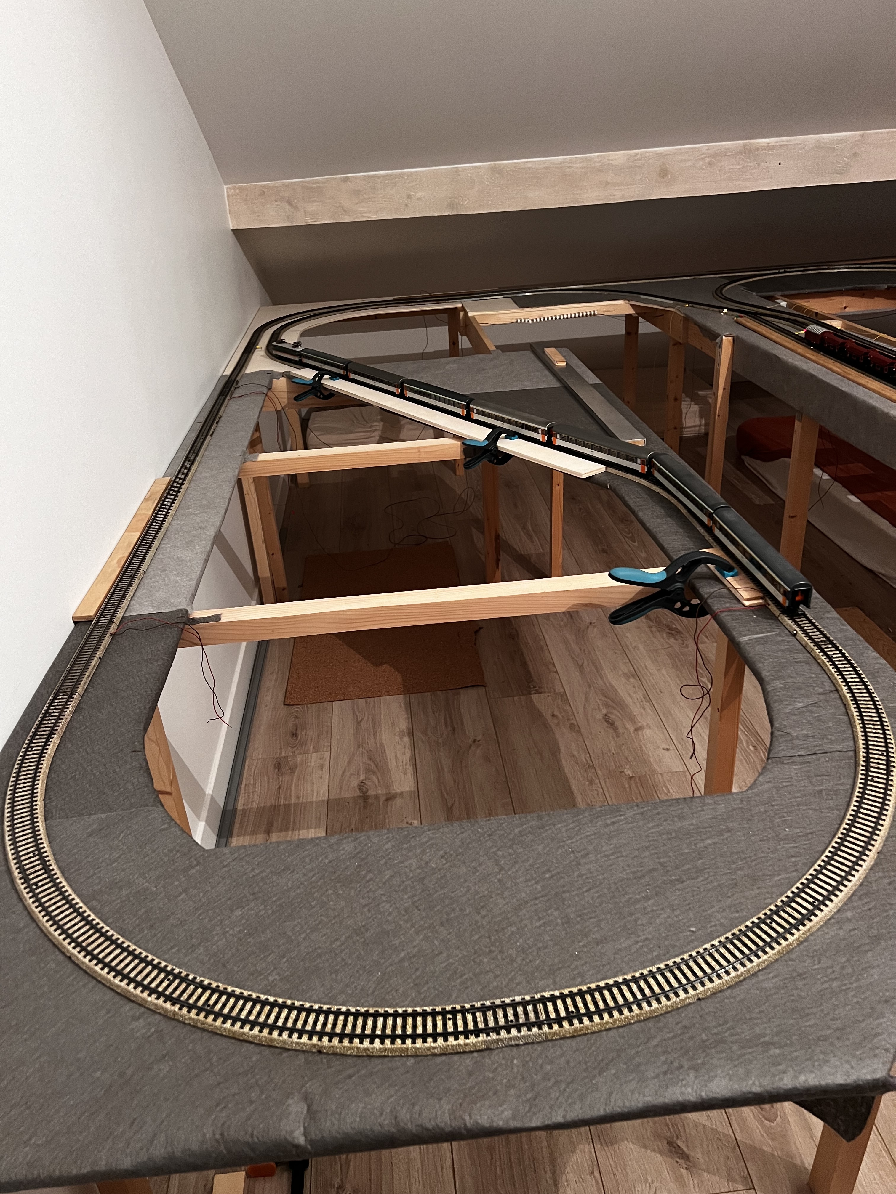 Pour les endroits sensibles je mettrai peut etre des bouts de contreplaqué le long d’un rail pour avoir des reperes et aider a tenir la voie M.