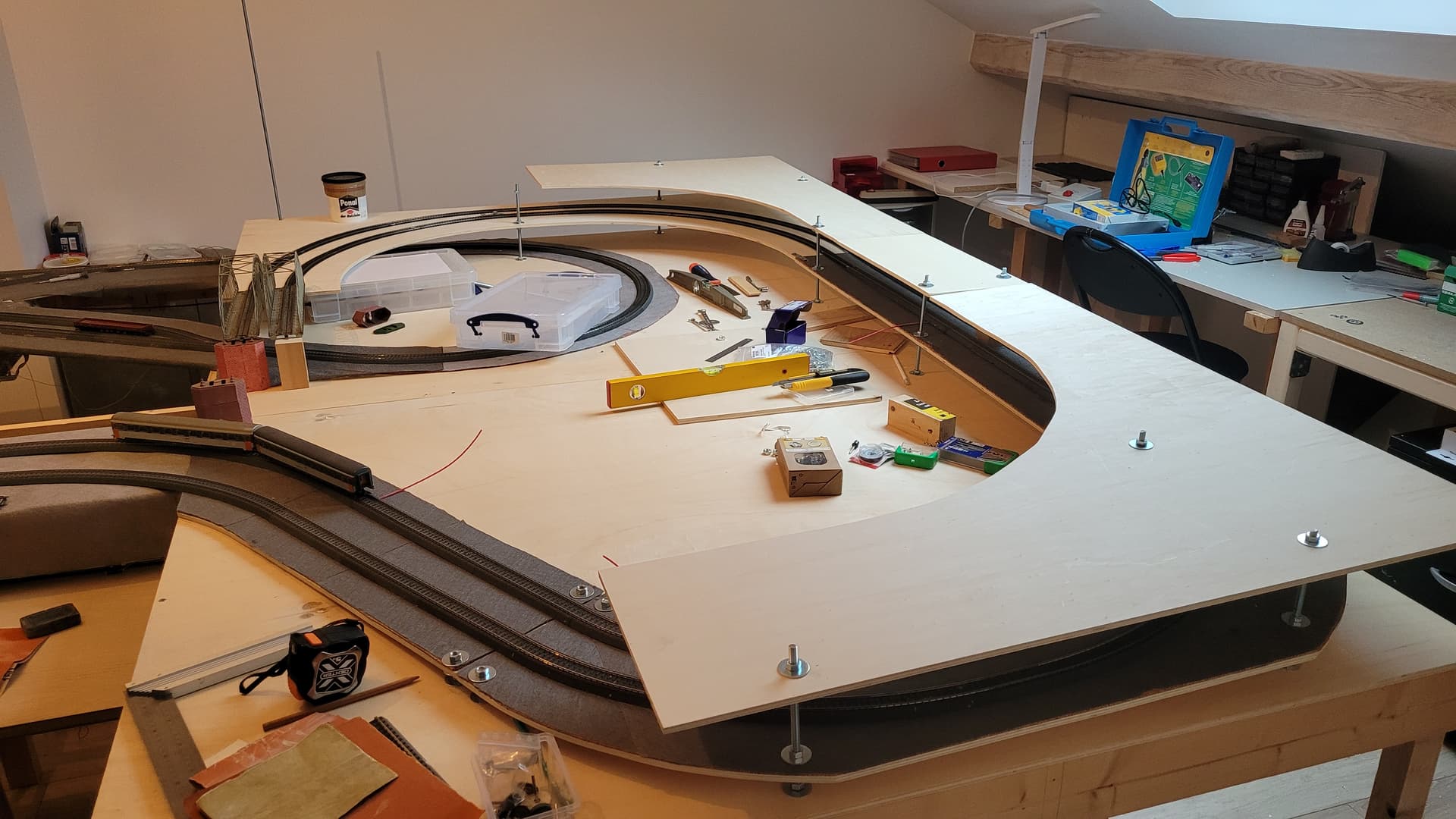 Sur mon réseau j’ai pour le niveau zéro (grande gare, dépôt, etc.) utilisé des plaques de 160 x 80x 18 de bois recomposé, fixées sur les cornières métalliques, ce qui assure une parfaite rigidité et légèreté de l’ensemble.