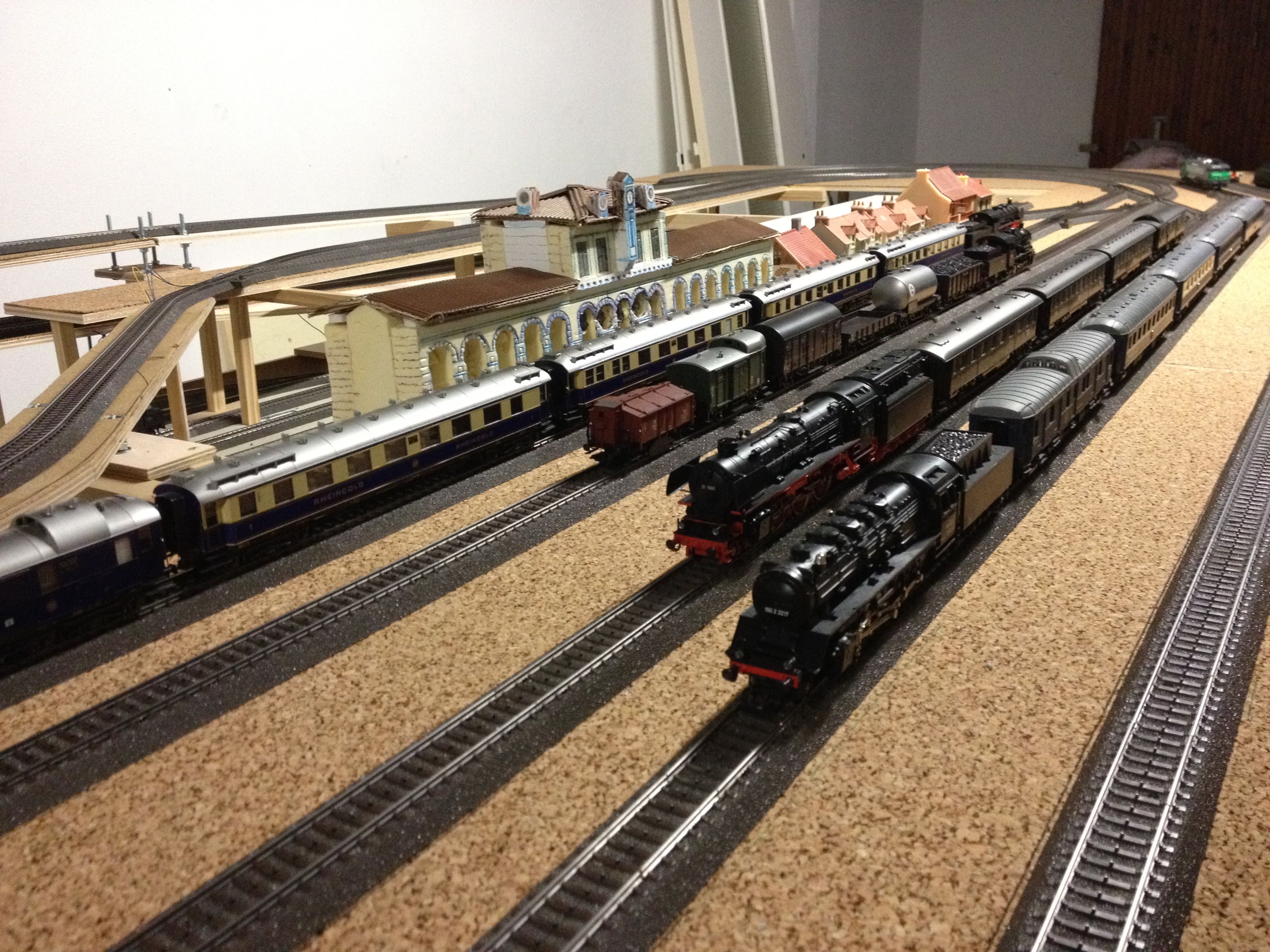 J’ai réussi à créer des itinéraires qui me permettent de lancer 8 rames. En réalité, compte tenu de mes cantons actuels, 3 ou 4 tout au plus circulent simultanément, les autres attendent leur tour. Mais au moins, cela permet de vérifier que tout est OK. Je me suis même amusé à faire une navette avec mon schienenbus et avec mon ICE.