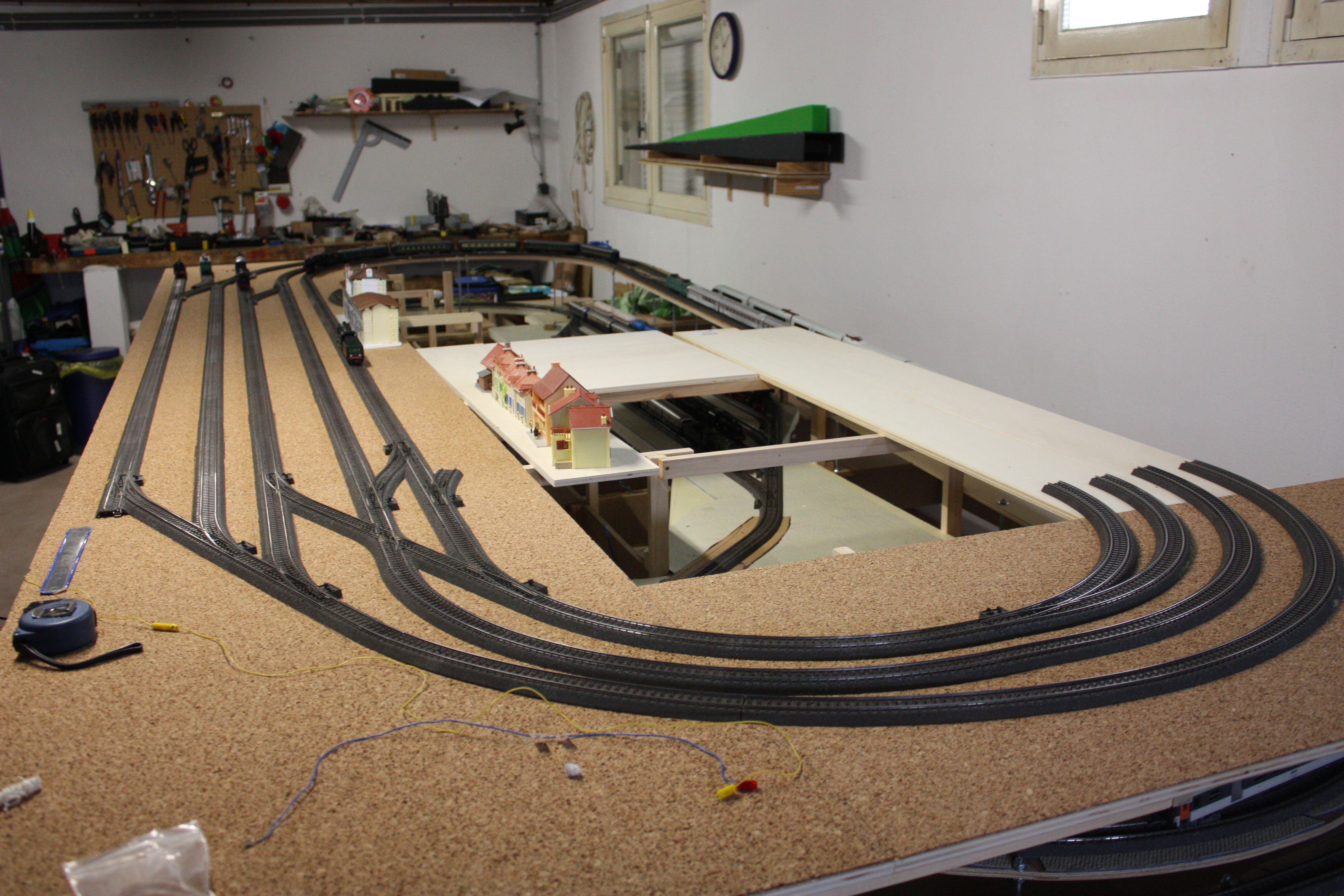 La pose des voies “quasi-définitive” (on ne sait jamais…), de la gare principale. Manque encore les deux voies de garage côté intérieur, il faut que j’achète des aiguillages