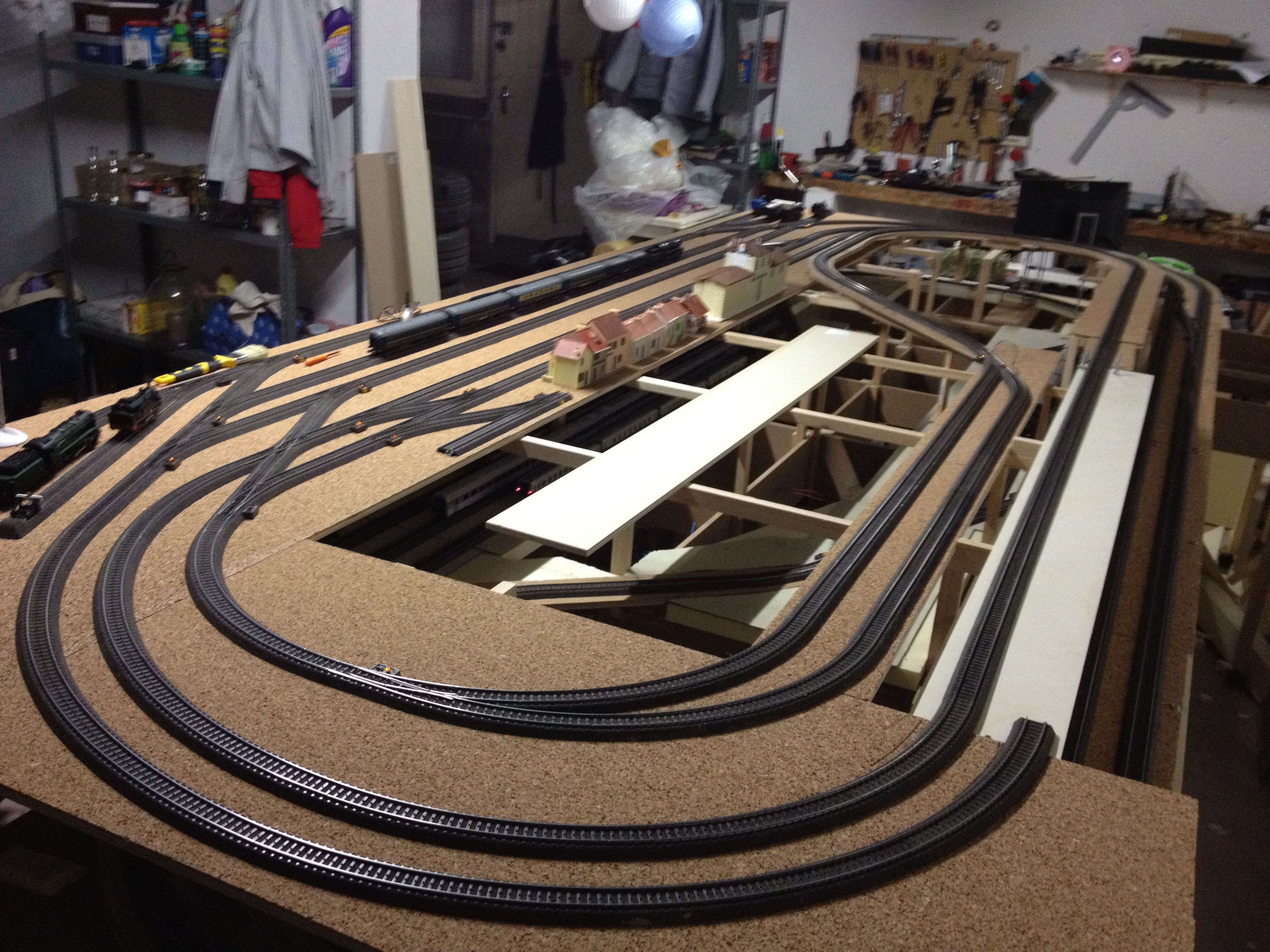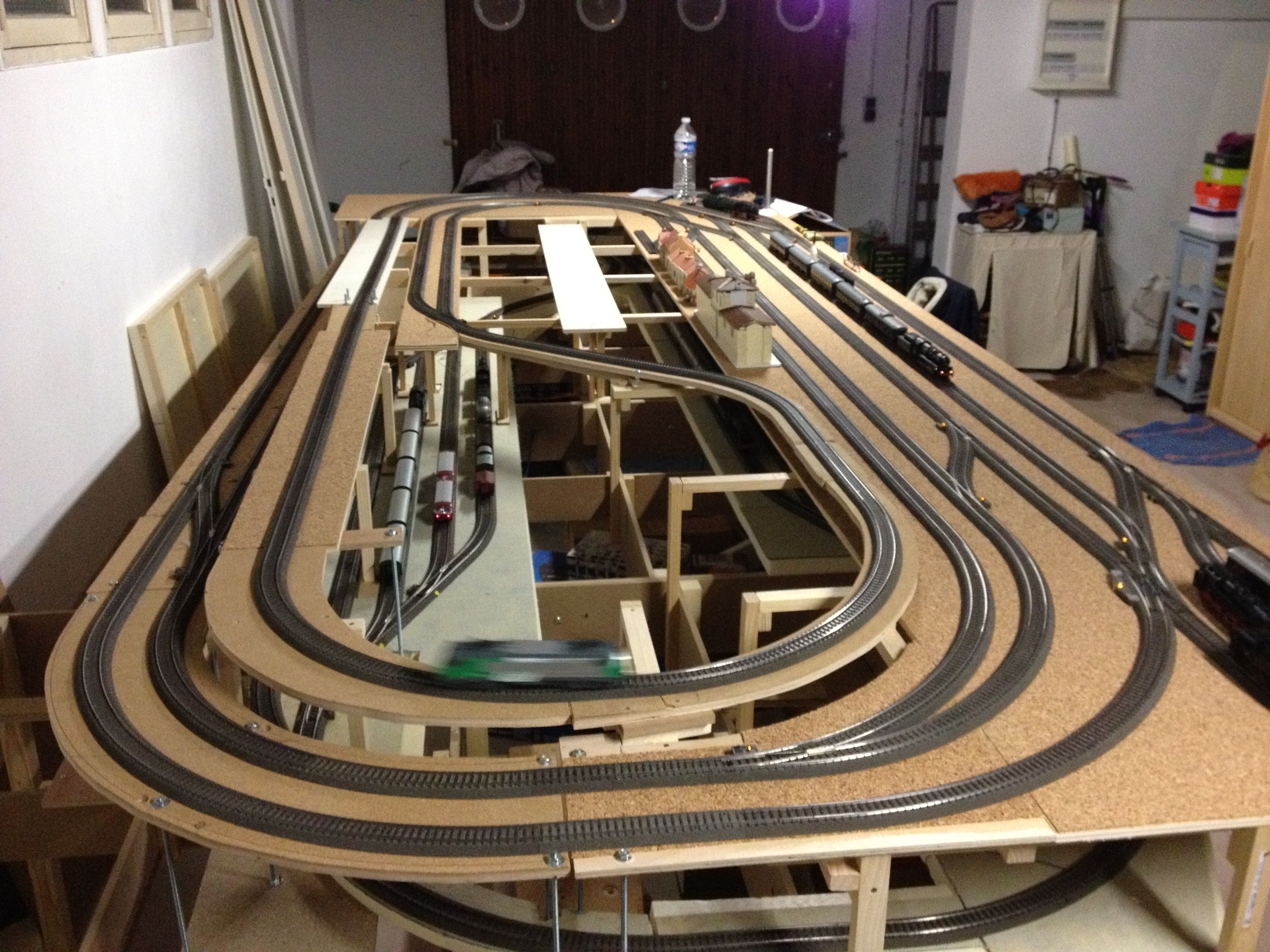 Le week end a été mis à profit pour réaliser une boucle temporaire en reliant la future voie unique partant de la gare principale à une des branches de la future voie de parade. Ils se trouve que ces voies doivent à terme bifurquer chacune dans un sens opposé côté Nord du réseau pour suivre leur chemin. Comme je viens de passer plusieurs semaines à faire de la menuiserie, poser mes voies et faire des branchements électriques pour la gare principale, j’avais à coeur de faire une pause dans la construction pour, d’une part voir de nouveau tourner mes trains