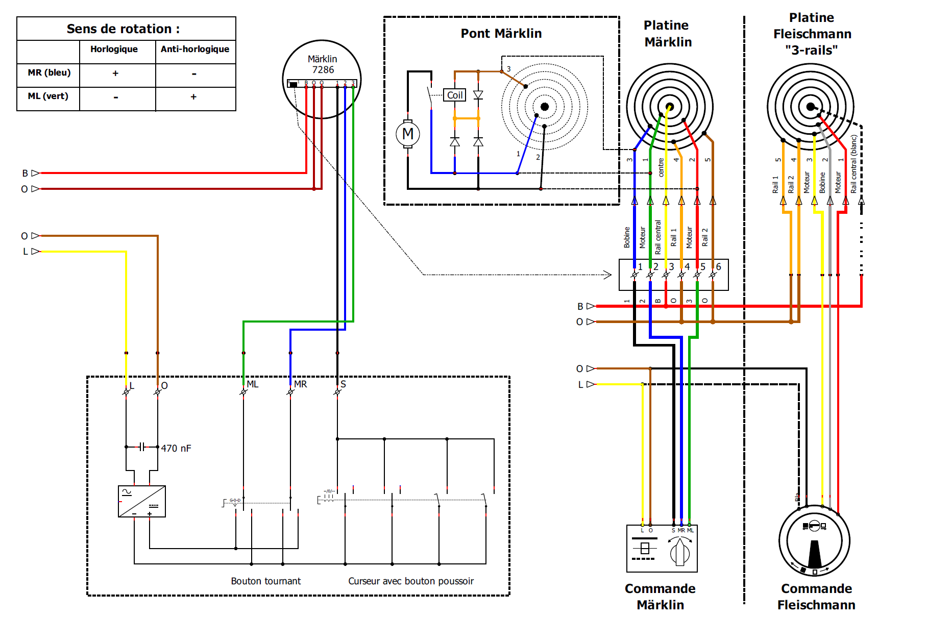 Pour être précis, il existe une différence de câblage entre les ponts Märklin et Fleischmann. Un des contacts rotatifs Moteur et celui de la Bobine sont inversés. Voici le schéma que j’en ai réalisé :