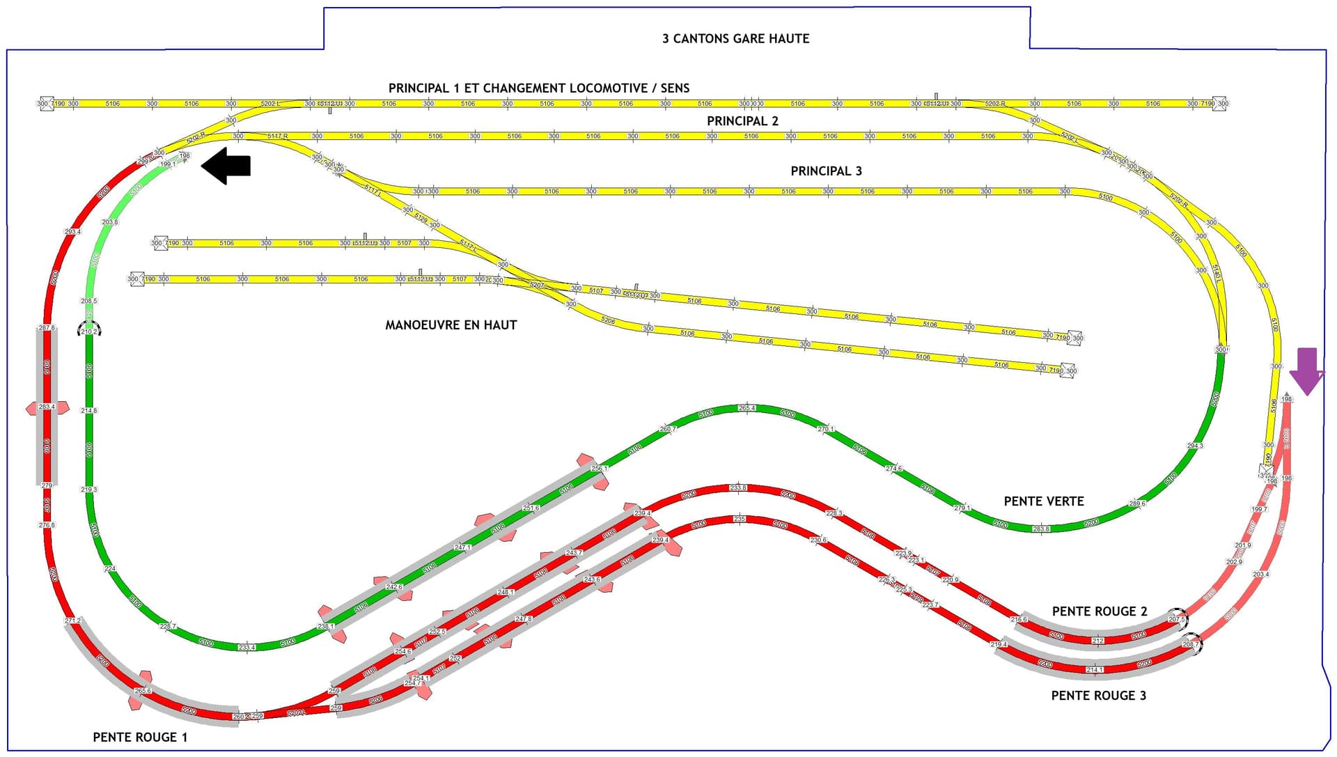 Puis une pente pour conduire un train à défaire / refaire à la partie supérieure. Les cantons supportent 1 m de wagons + loco tender de 27 cm avec le patin sous le tender 10 cm.