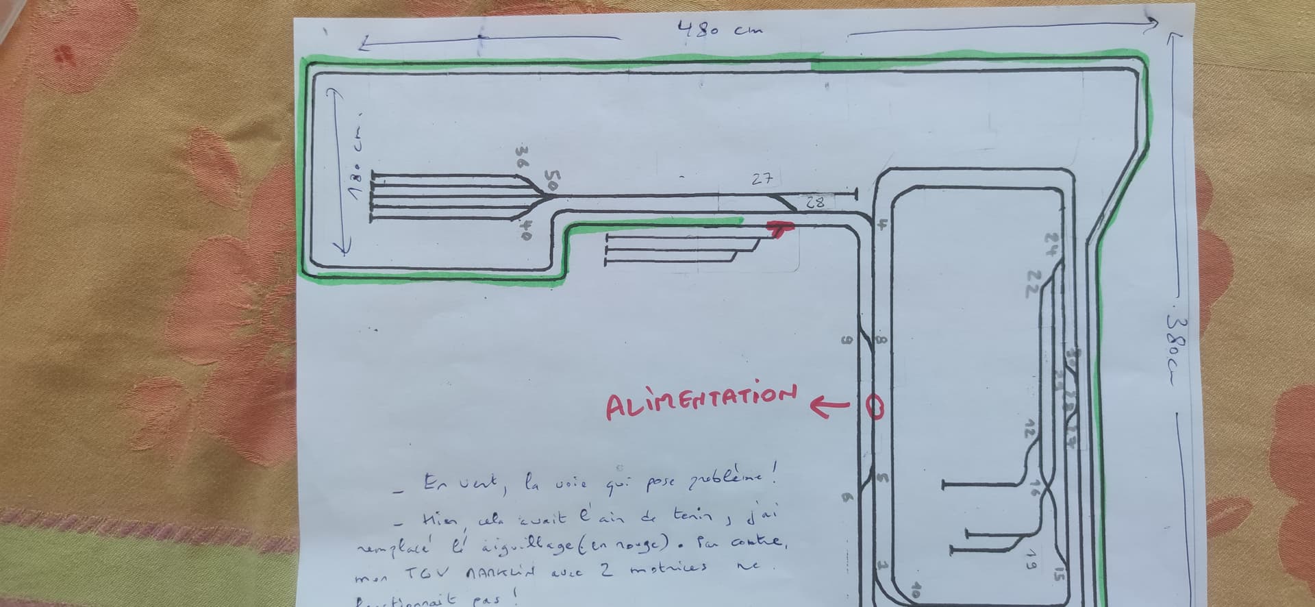Quand je vois ton plan et le linéaire de ton réseau, pour moi il faut nécessairement réalimenter les rails tous les 2 à 3 mètres sinon tu vas te retrouver avec des baisses de tension à certains endroits et ton matériel avancera au ralenti voir plus du tout (tu cites le cas de ton TGV dans le texte sur ton plan).