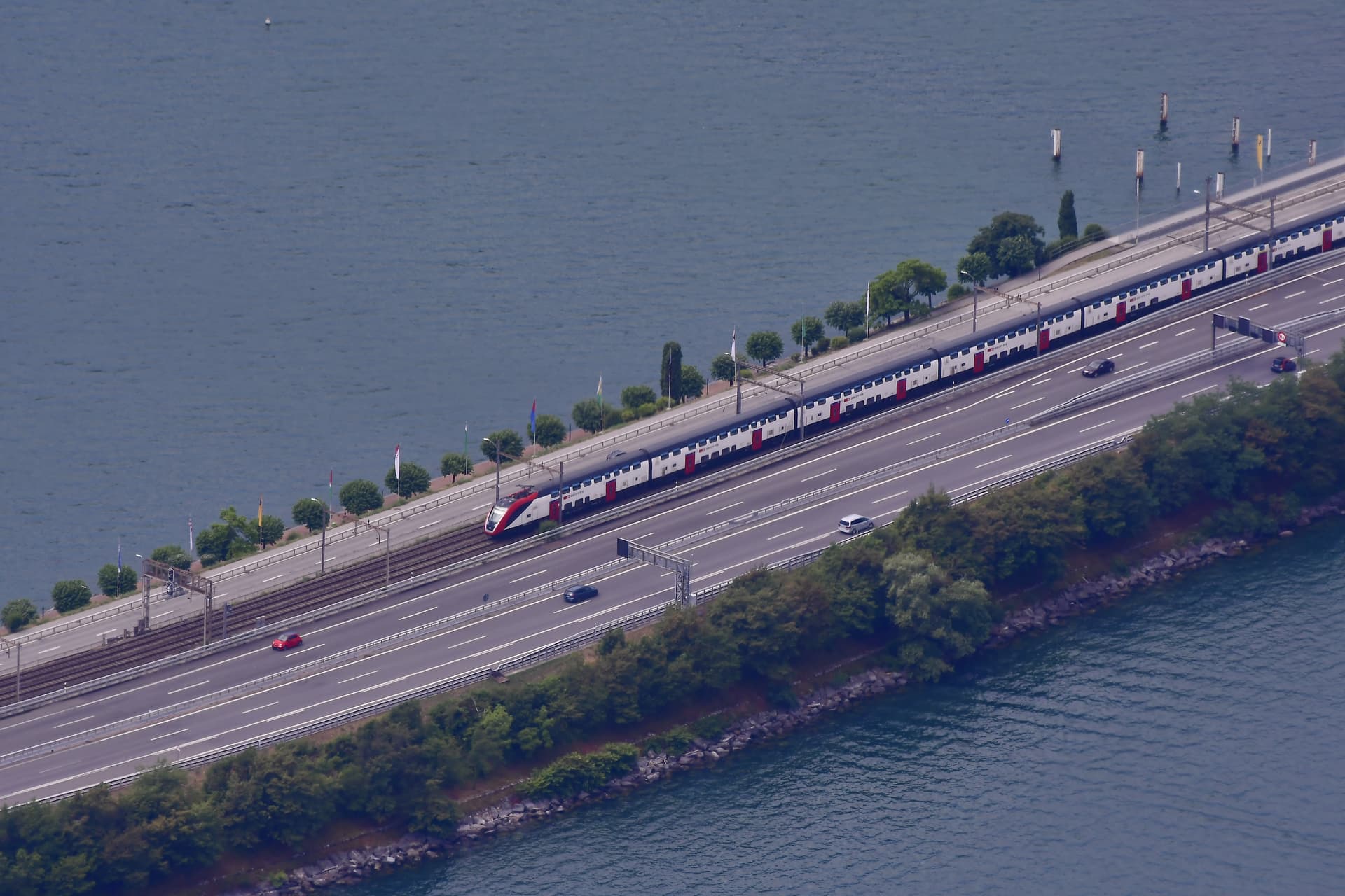 En revenant un petit instant sur le thème appareils photo, je l’ai prise du sommet du Monte Generoso (1700 mi) en Tessin tandis que le convoi passait sur le ponte di Melide sur le lac de Lugano.