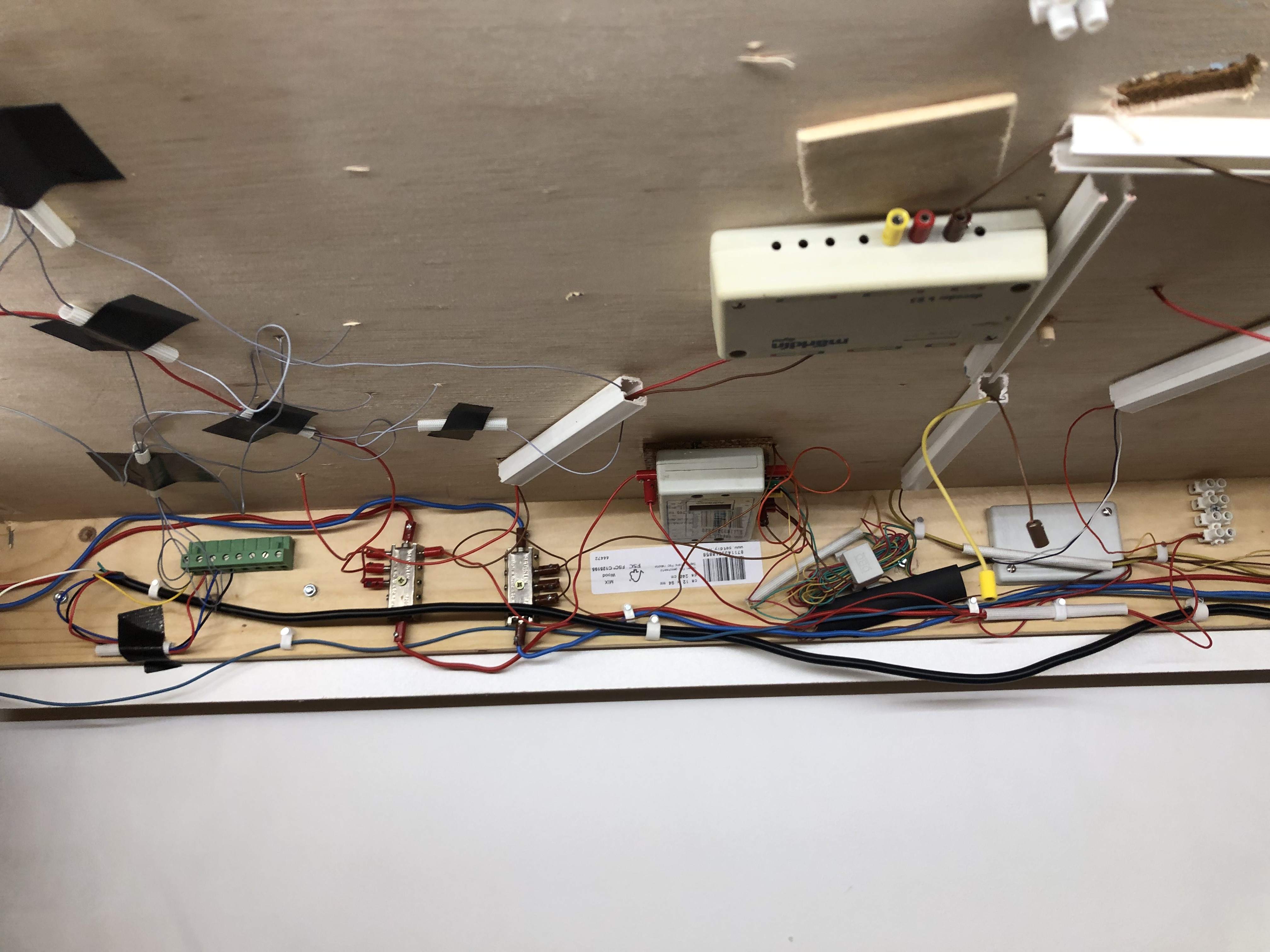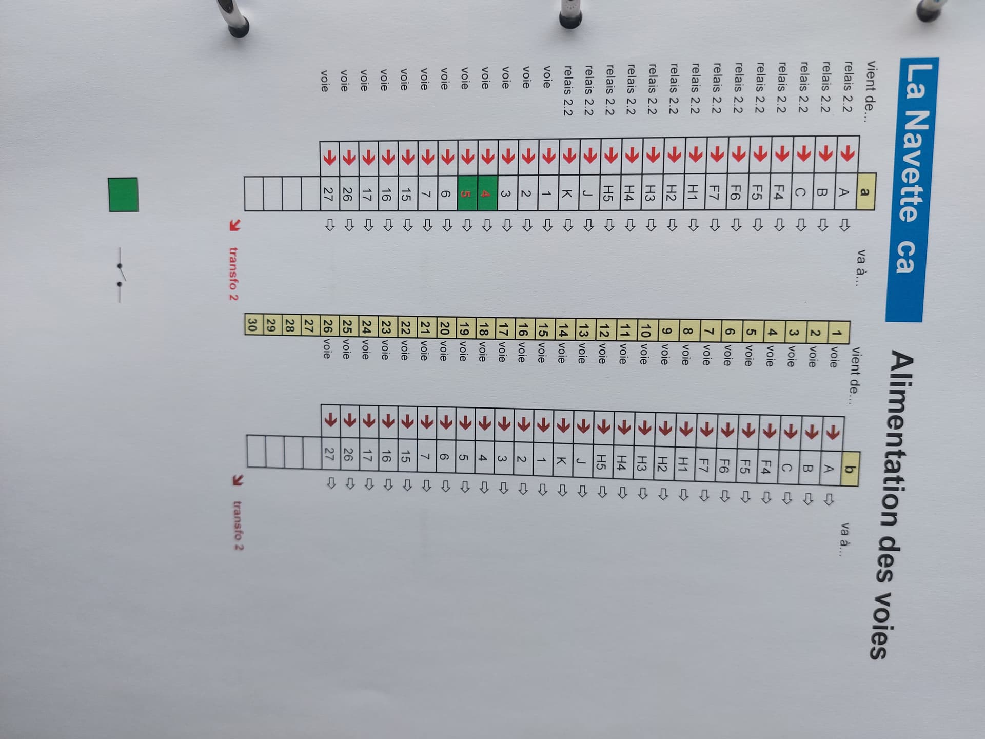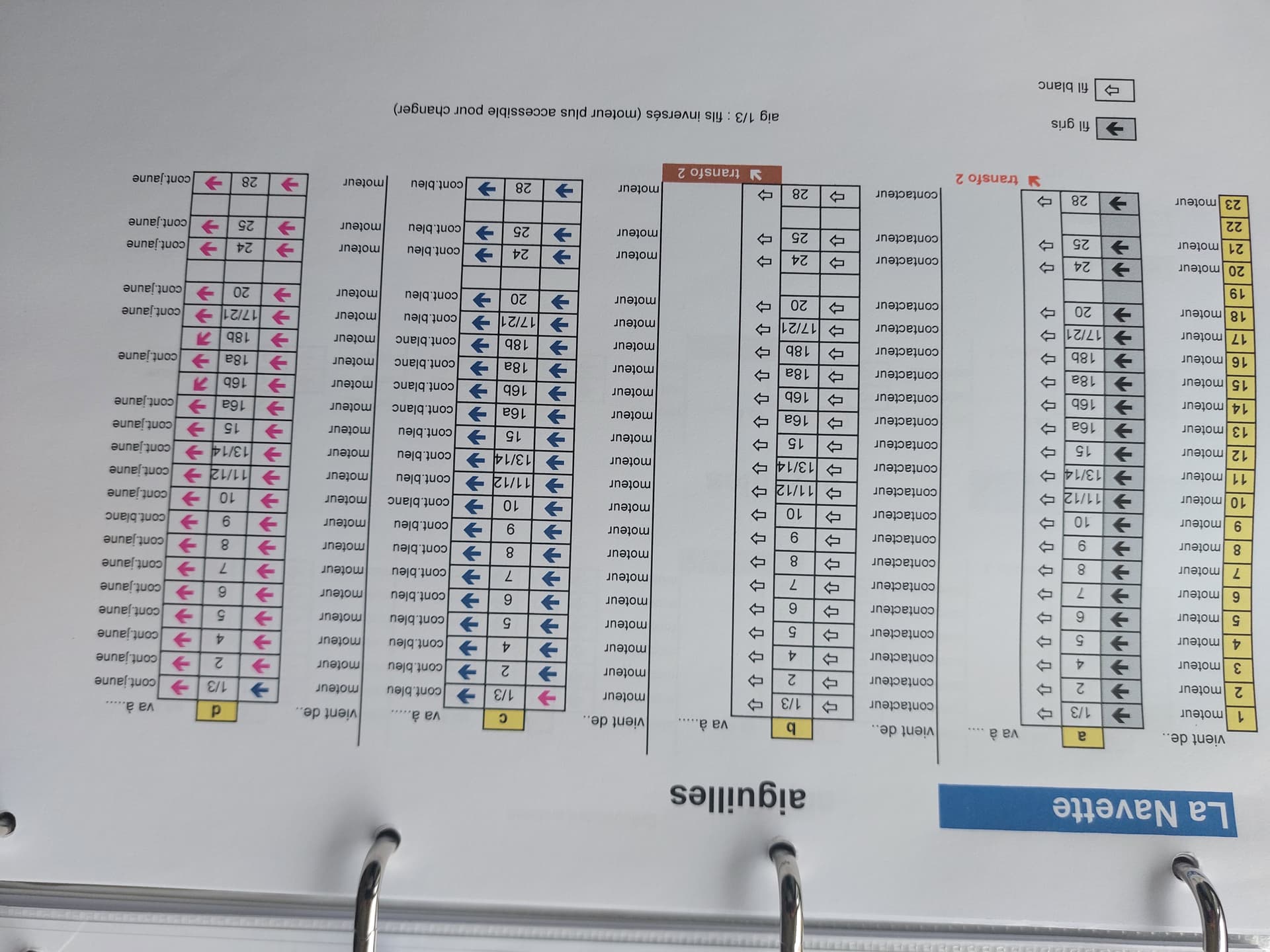 . Chaque fil arrive sur un strips et repart sur un point alimentation(Transfo). Les strips sont numérotés, avec la mention fil arrive de… fil va à… la flèche indique la couleur du fil.