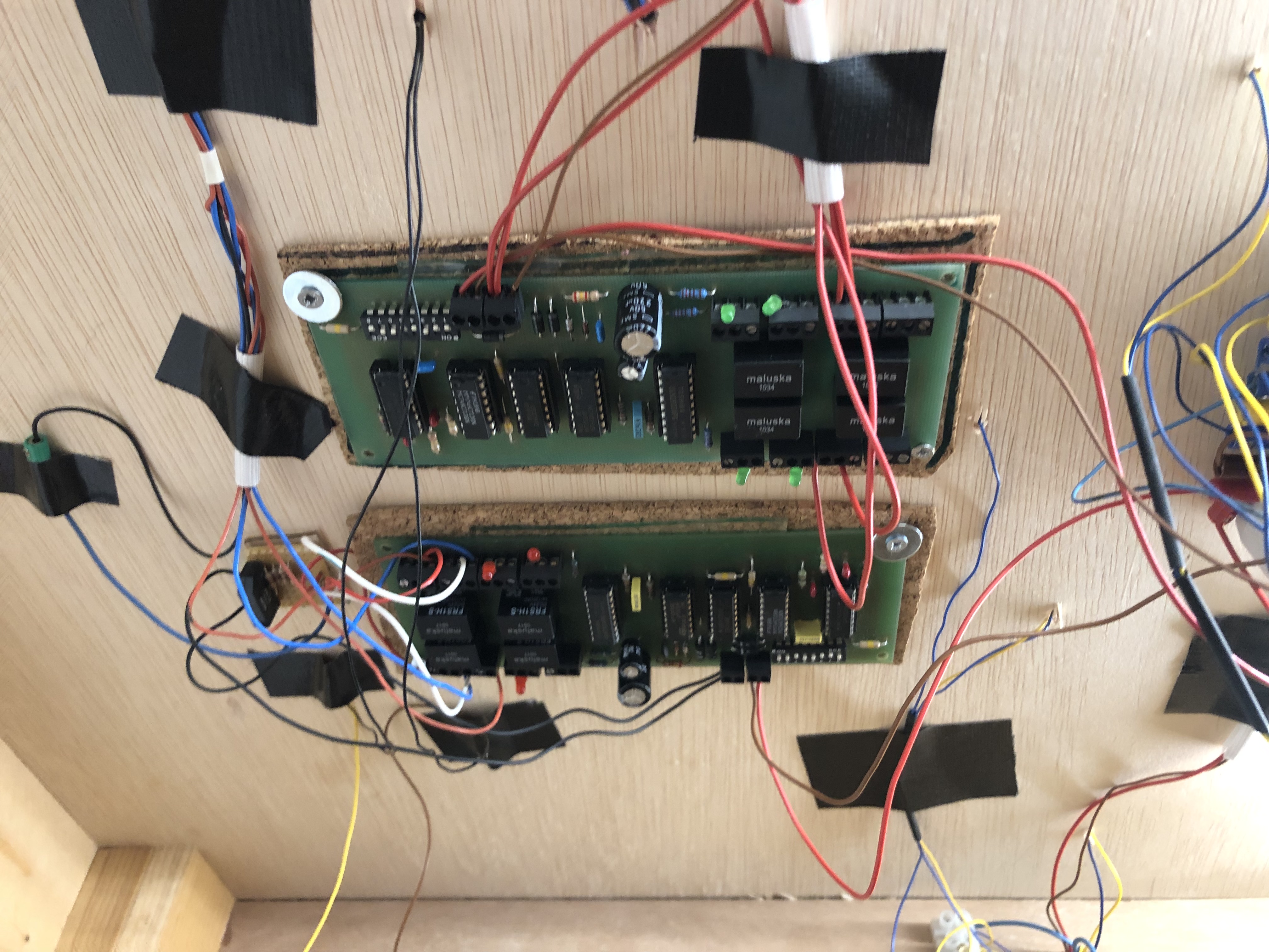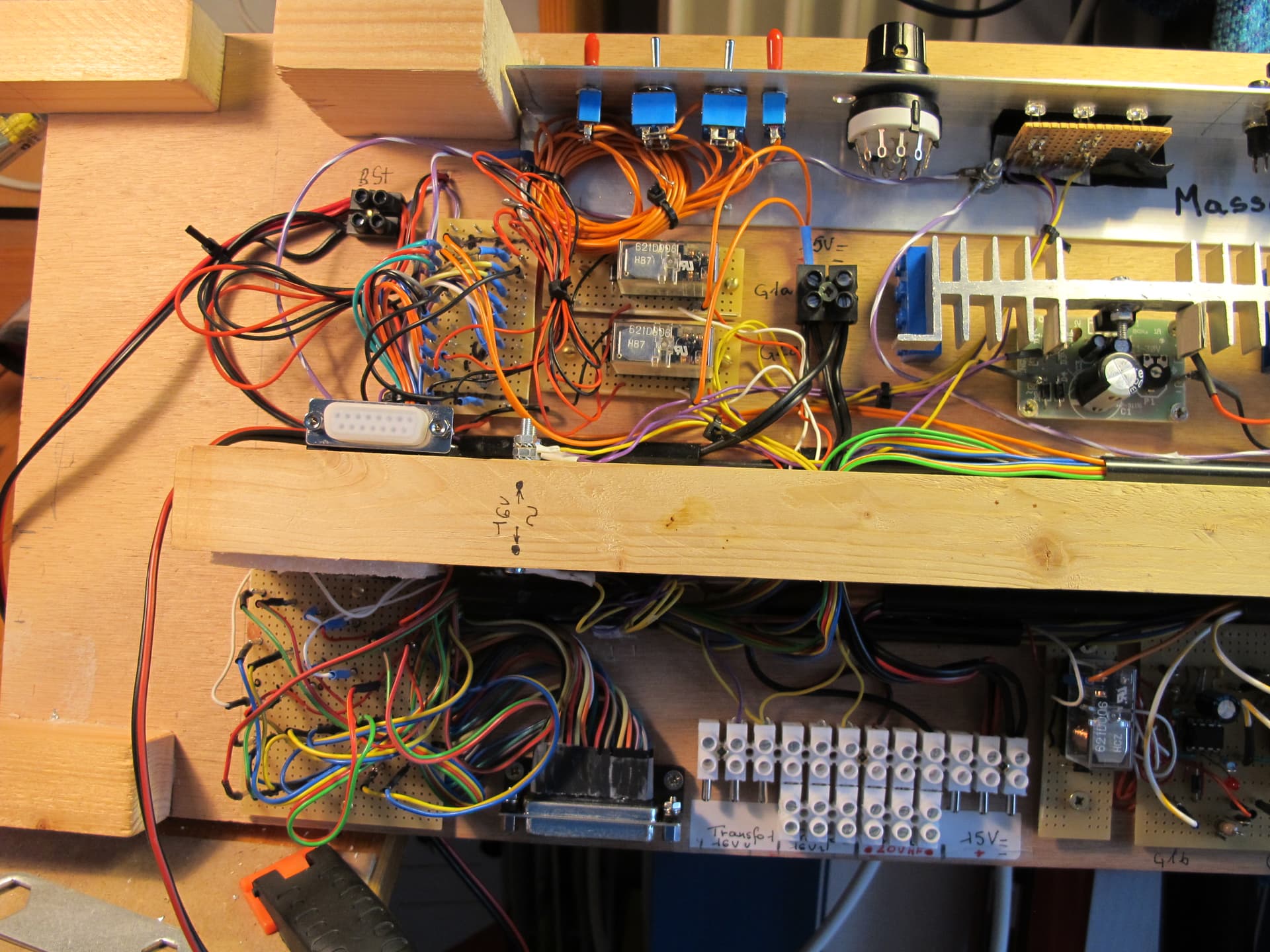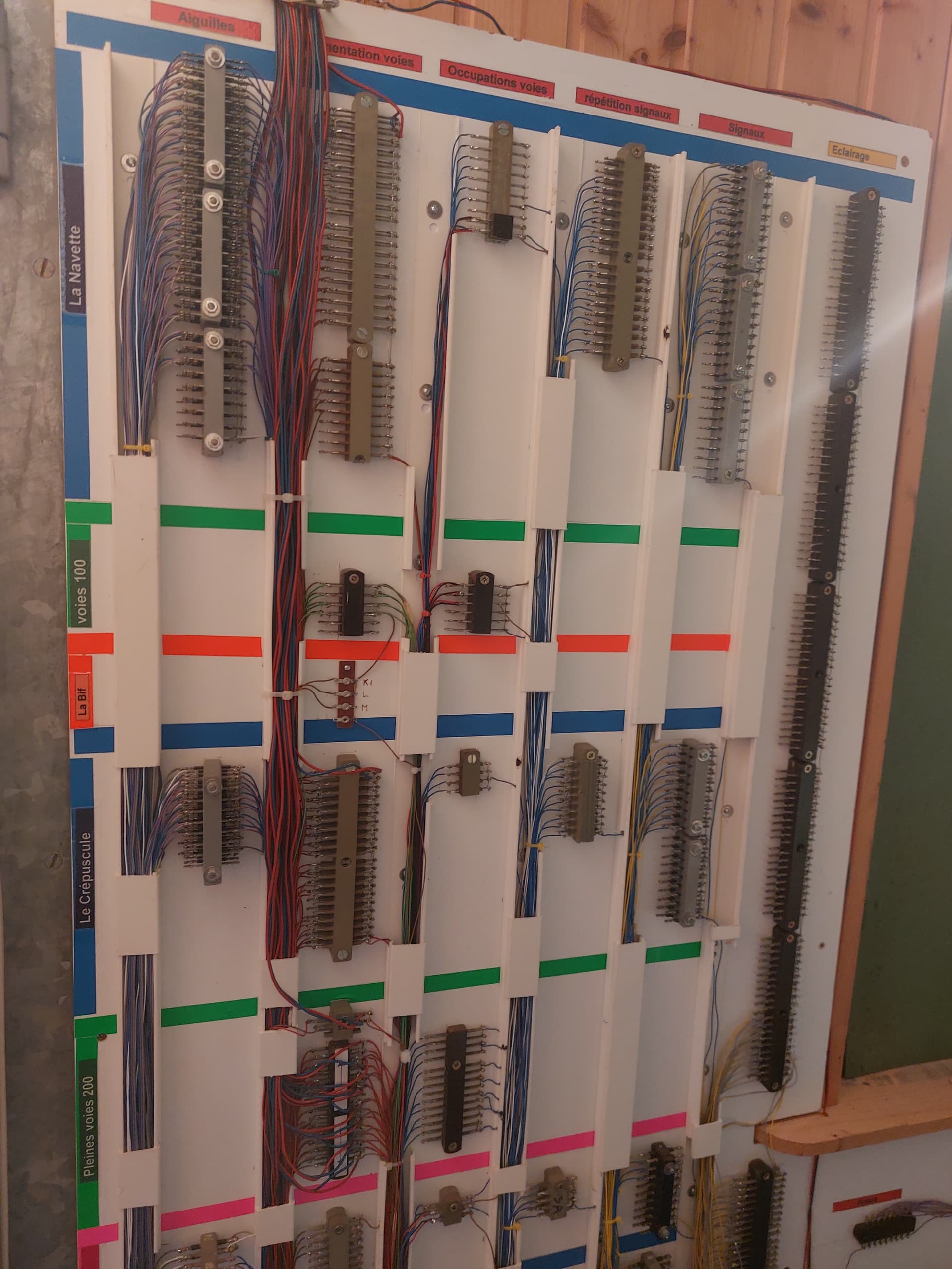 La salade de fils ne me fait pas trop peur… L’important est de bien les repérer, au départ et à l’arrivée… En bas au centre le "peigne de dominos d’alimentation générale (16V alternatif, courant de traction, 15V continu). En bas à gauche, la plaque de brassage des arrivées des contact d’occupation de voies (carte avec broches à enficher, câbles avec cosse enfichable).