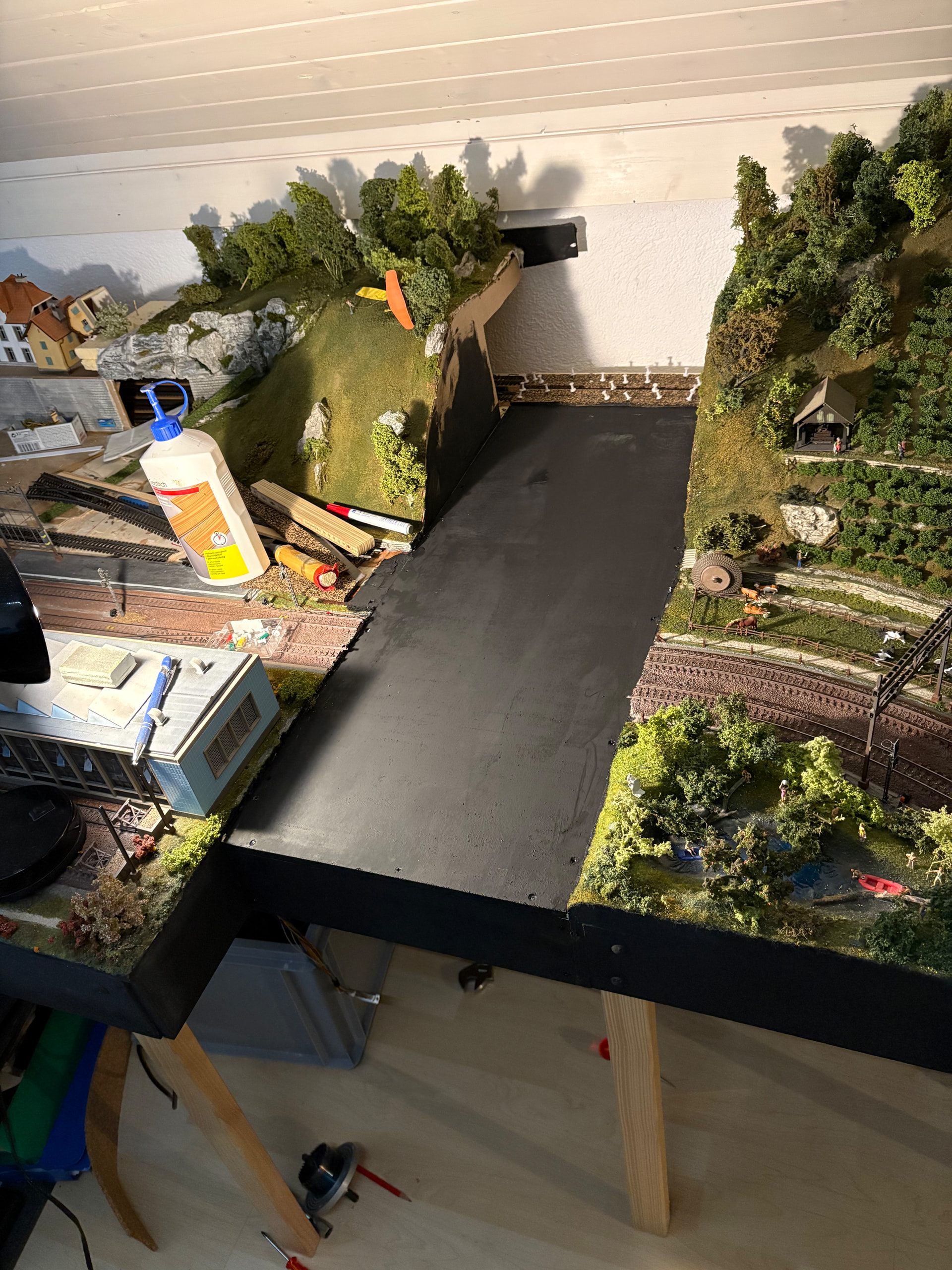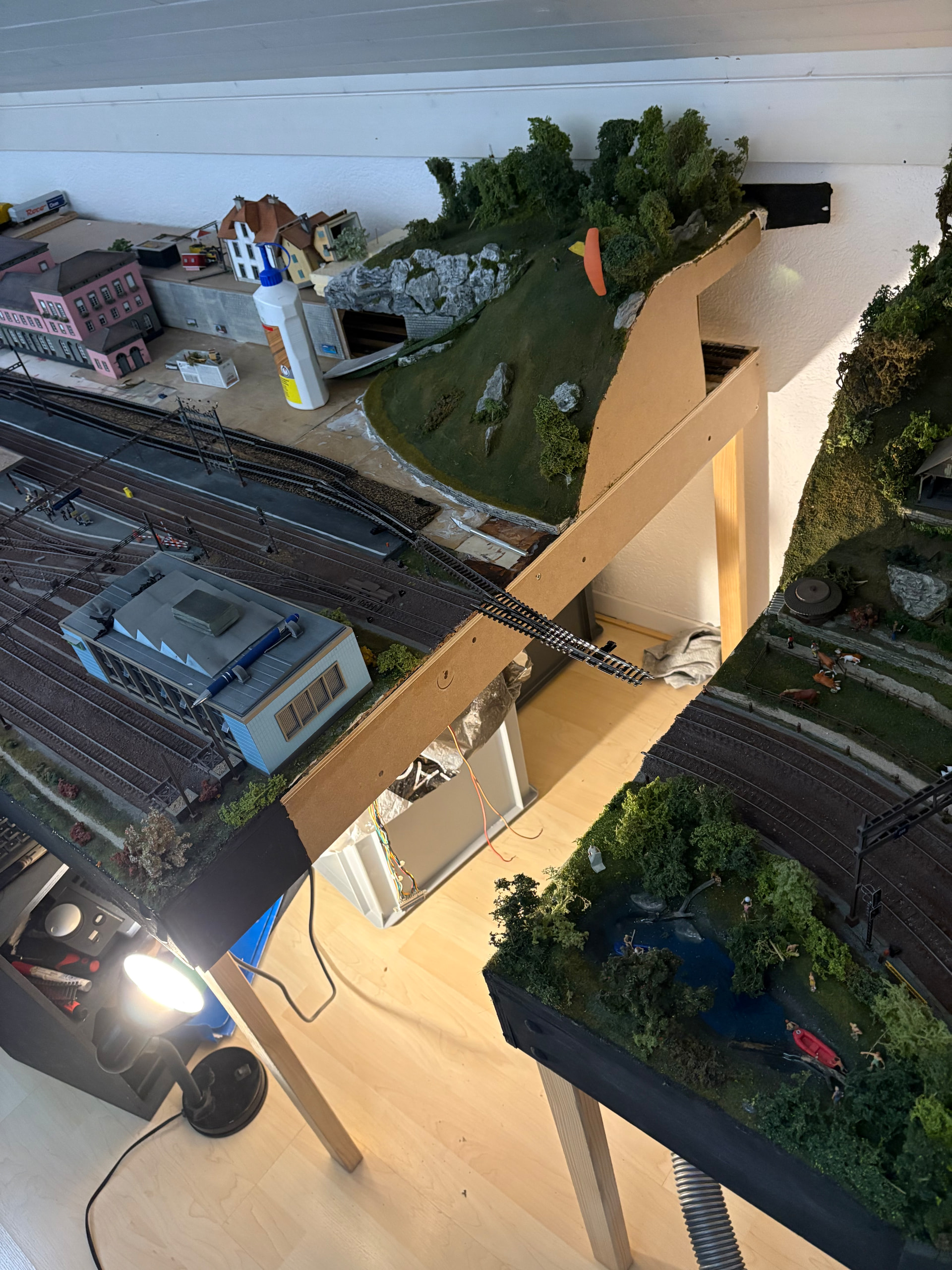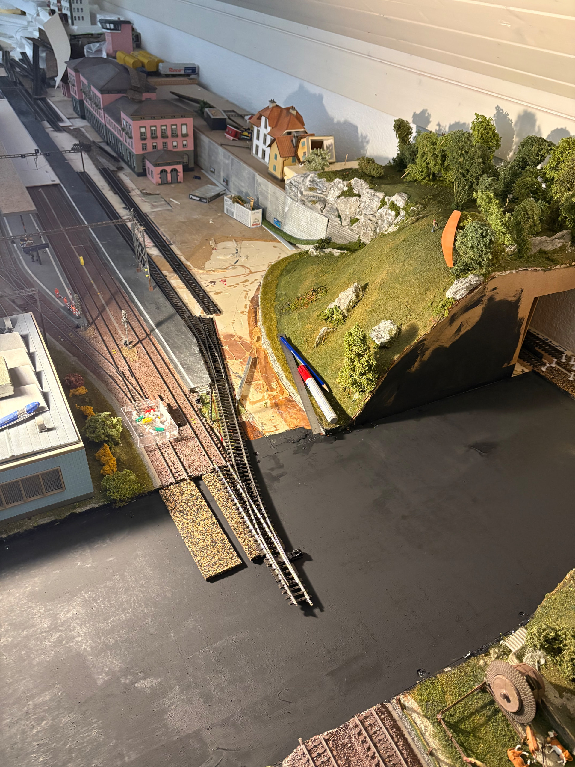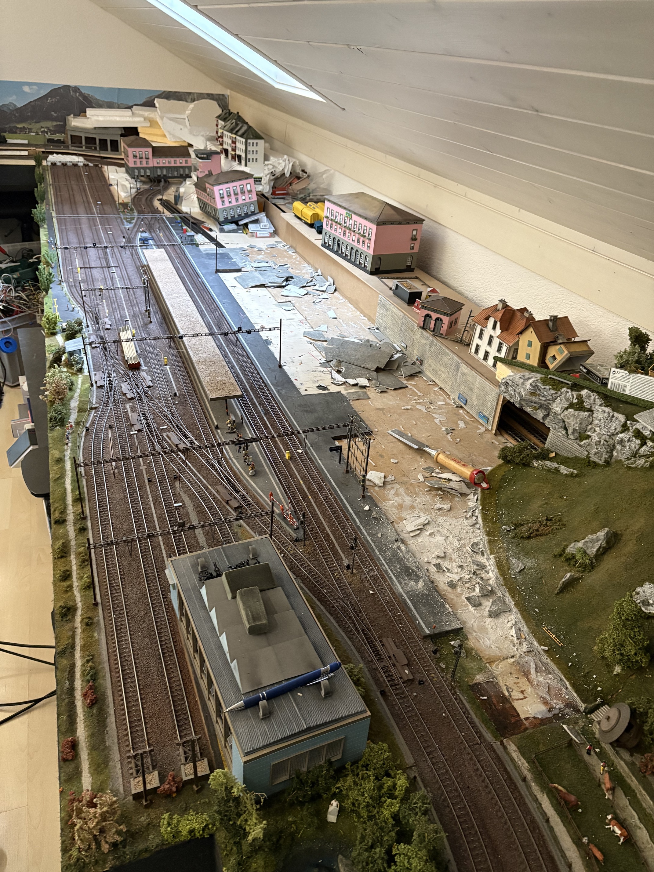 J ai débuté la modification de ma maquette . A la base , la gare principale n a que 3 voies, une erreur de conception . Je vais ajouter 2 voies supplémentaires ce qui me permettra d avoir plus de possibilités. Voilà les premières photos . Démontage de la gare et la partie pavée . J ai aussi rallongé la partie en transformation de 35 cm .