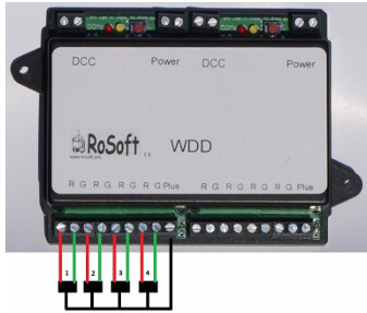 en appuyant sur le bouton (en haut à gauche pour les 4 premiers aiguillages la diode jaune s’allume