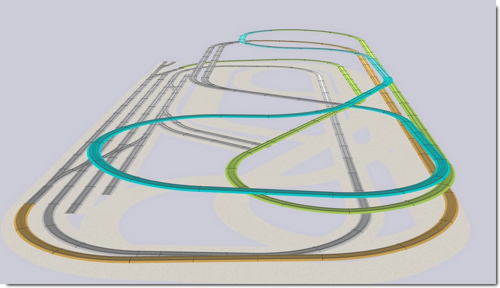 Vue en mode plan 3D légèrement incliné vers l’arrière pour dégager les voies superposées :