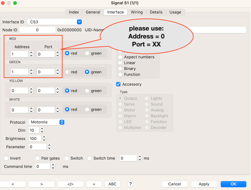 Par contre pour les aiguillages cela ne fonctionnait pas. En fait dans la fenêtre des propriétés des aiguillages (Objets > Aiguillages), sous l’onglet interface, tout en bas j’avais décoché “accessoire” pour activer “servomoteur” (oui mes aiguilles bougent à l’aide de servo. Je confirme, il faut absolument laisser coché “accessoire”