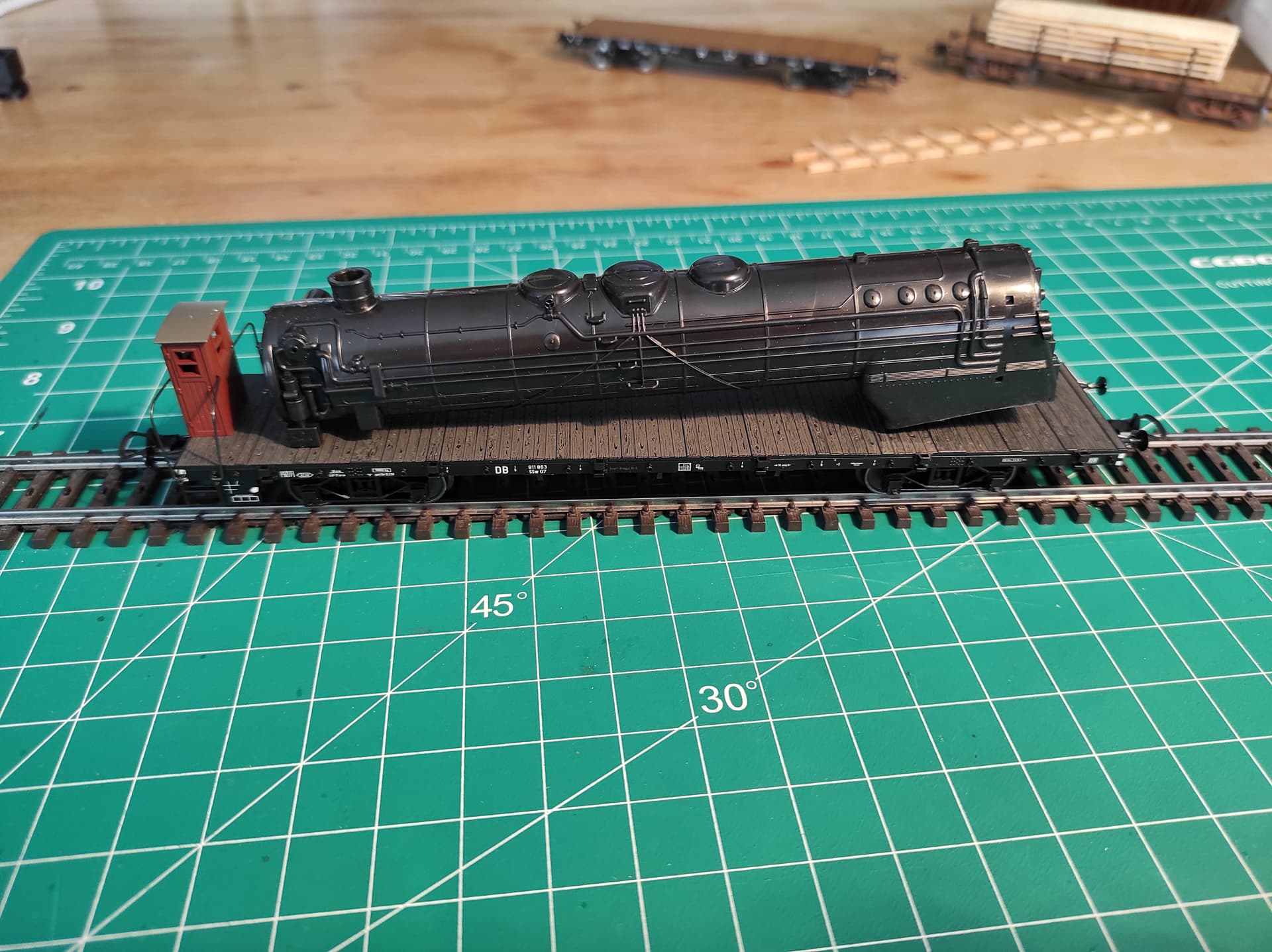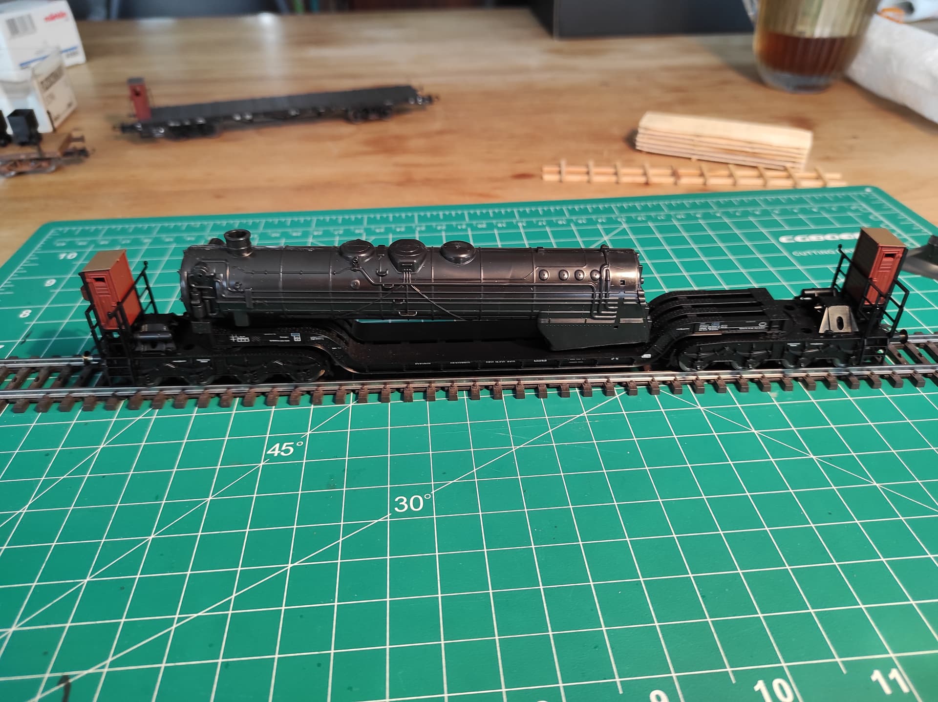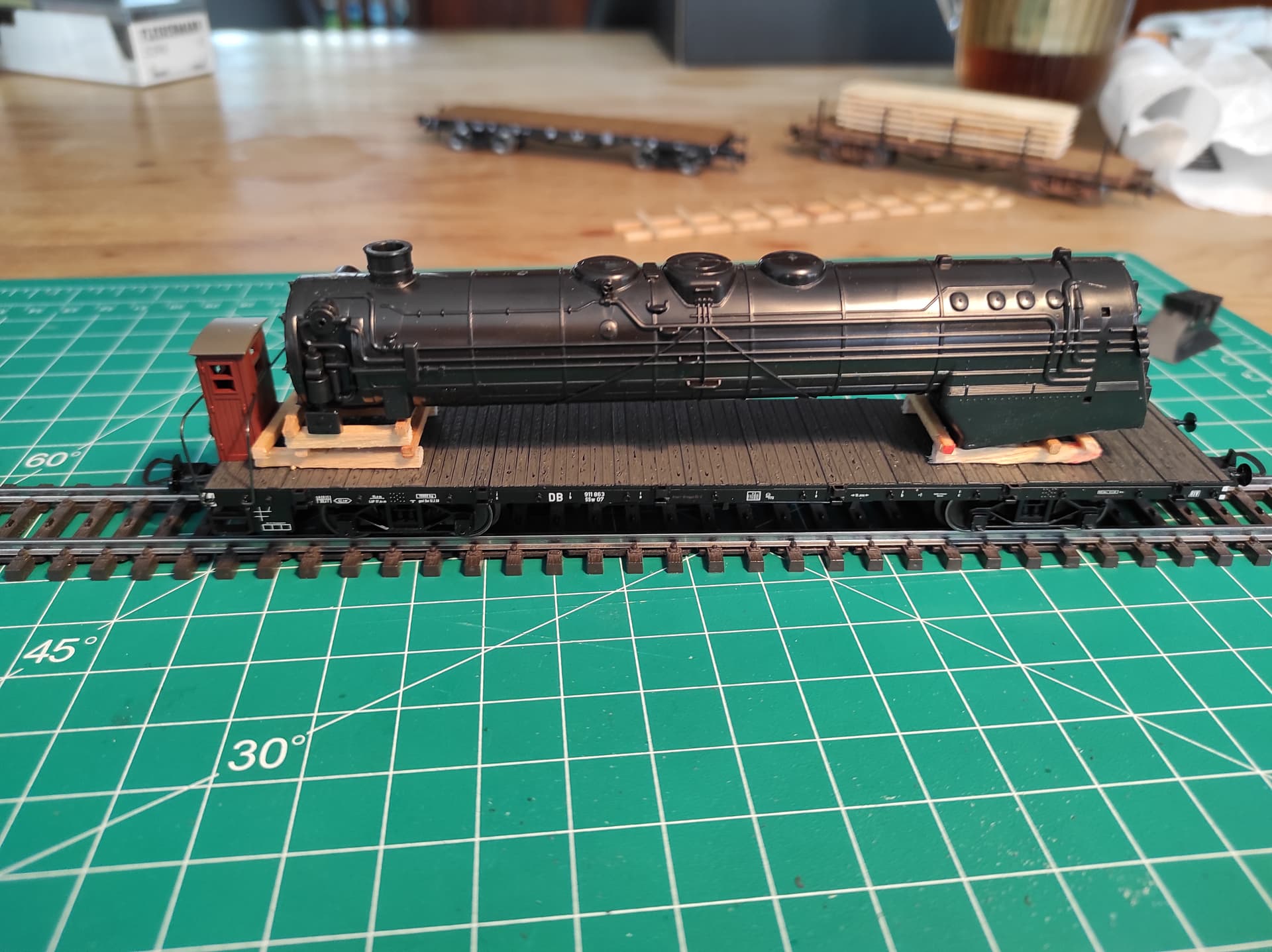 ça fait agréable à voir - mais j’ai eu un doute sur la charge possible de ce wagon. Après vérification, cette chaudière pèse quand même plus de 29 tonnes. Il vaut donc mieux trouver un wagon porteur à 4 essieux.