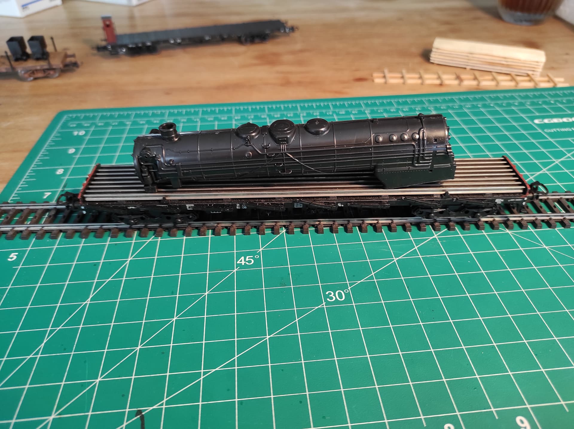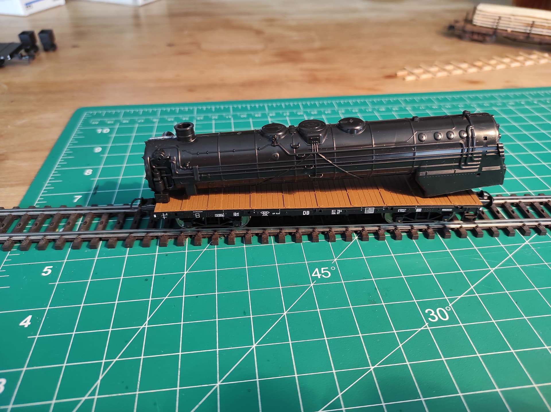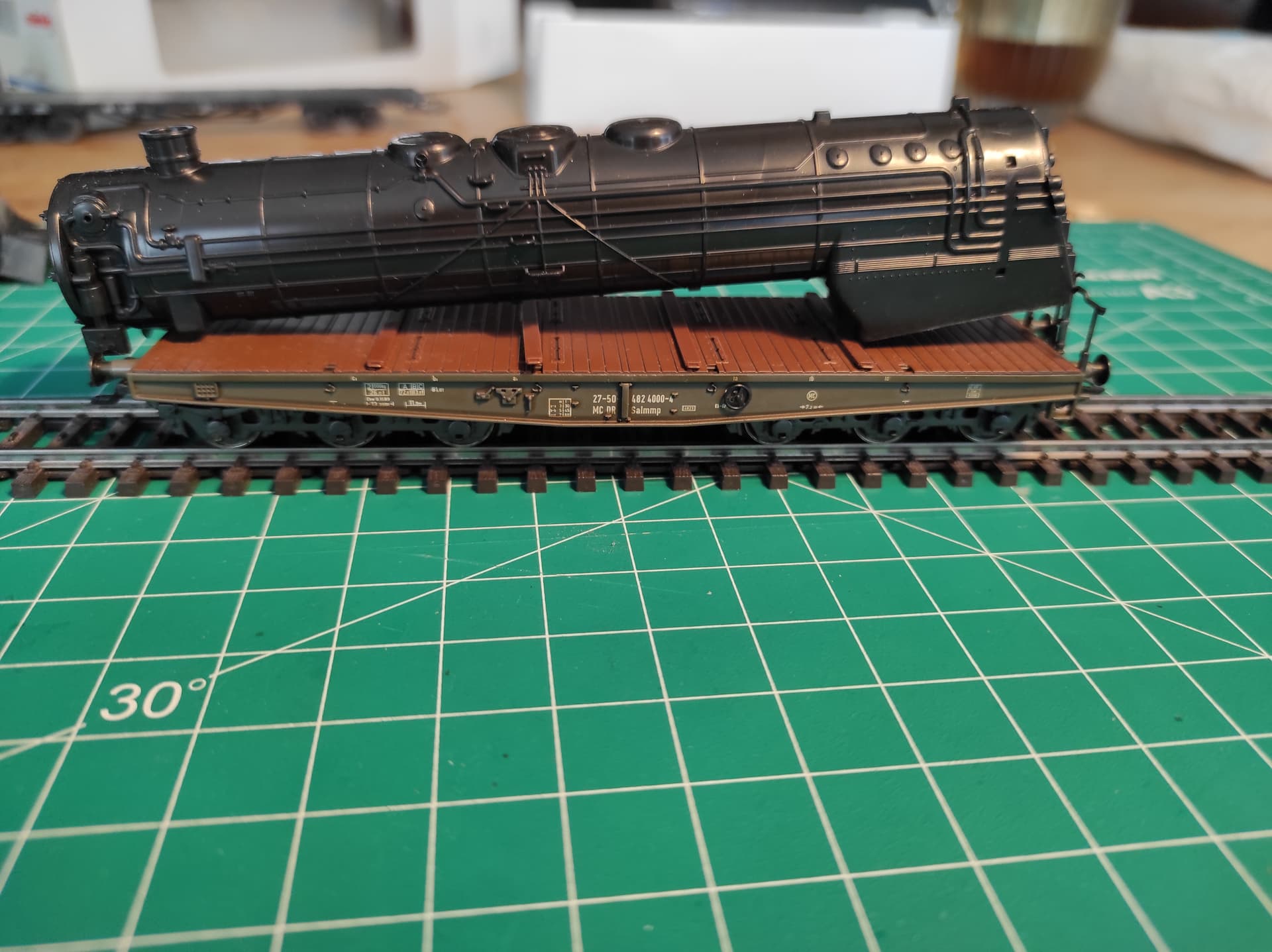 ça fait agréable à voir - mais j’ai eu un doute sur la charge possible de ce wagon. Après vérification, cette chaudière pèse quand même plus de 29 tonnes. Il vaut donc mieux trouver un wagon porteur à 4 essieux.