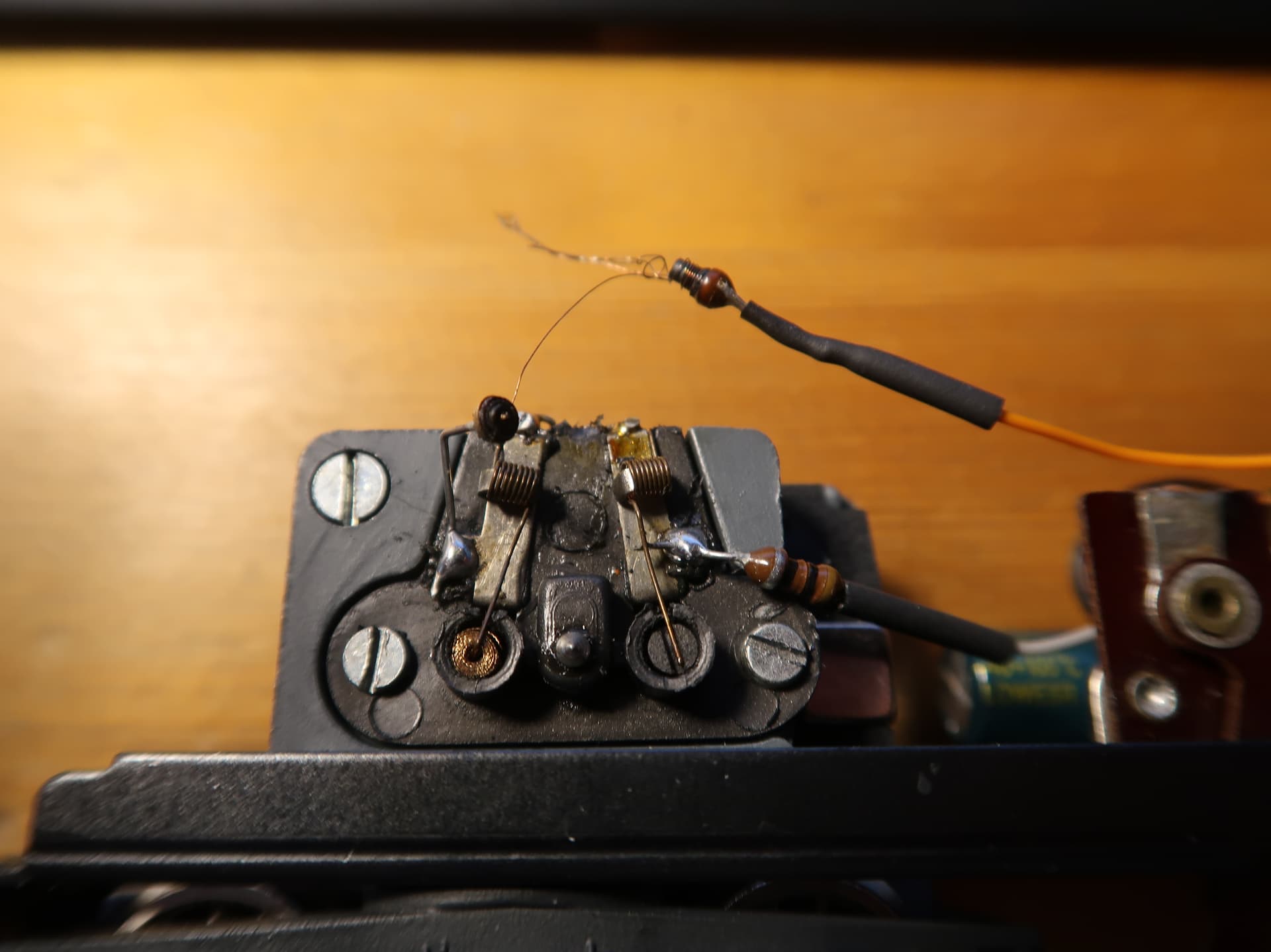Après dépose de la caisse, j’ai constaté que l’origine du sinistre était une self soudée sur une des bornes du collecteur que j’ai retrouvée entièrement grillée. Elle ne peut donc qu’avoir été mise en court-circuit. Et c’est là que je suis confronté à une énigme. Le côté de la self raccordé au décodeur est isolé par de la gaine thermorétractable. Il ne peut donc pas avoir été électriquement au contact de l’autre borne de collecteur. Le corps de la self peut-il donc être conducteur ?
