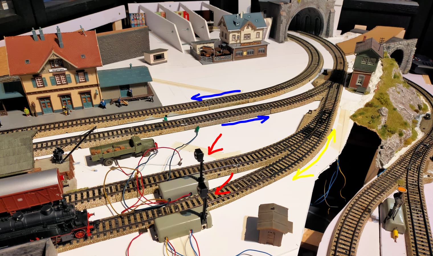 Je précise qu’il y aura un signal principal sur la voie de circulation (flèche bleue) que je n’ai pas encore installé et qui marquera la sortie de la gare (juste avant l’aiguillage pour aller en voie de garage).