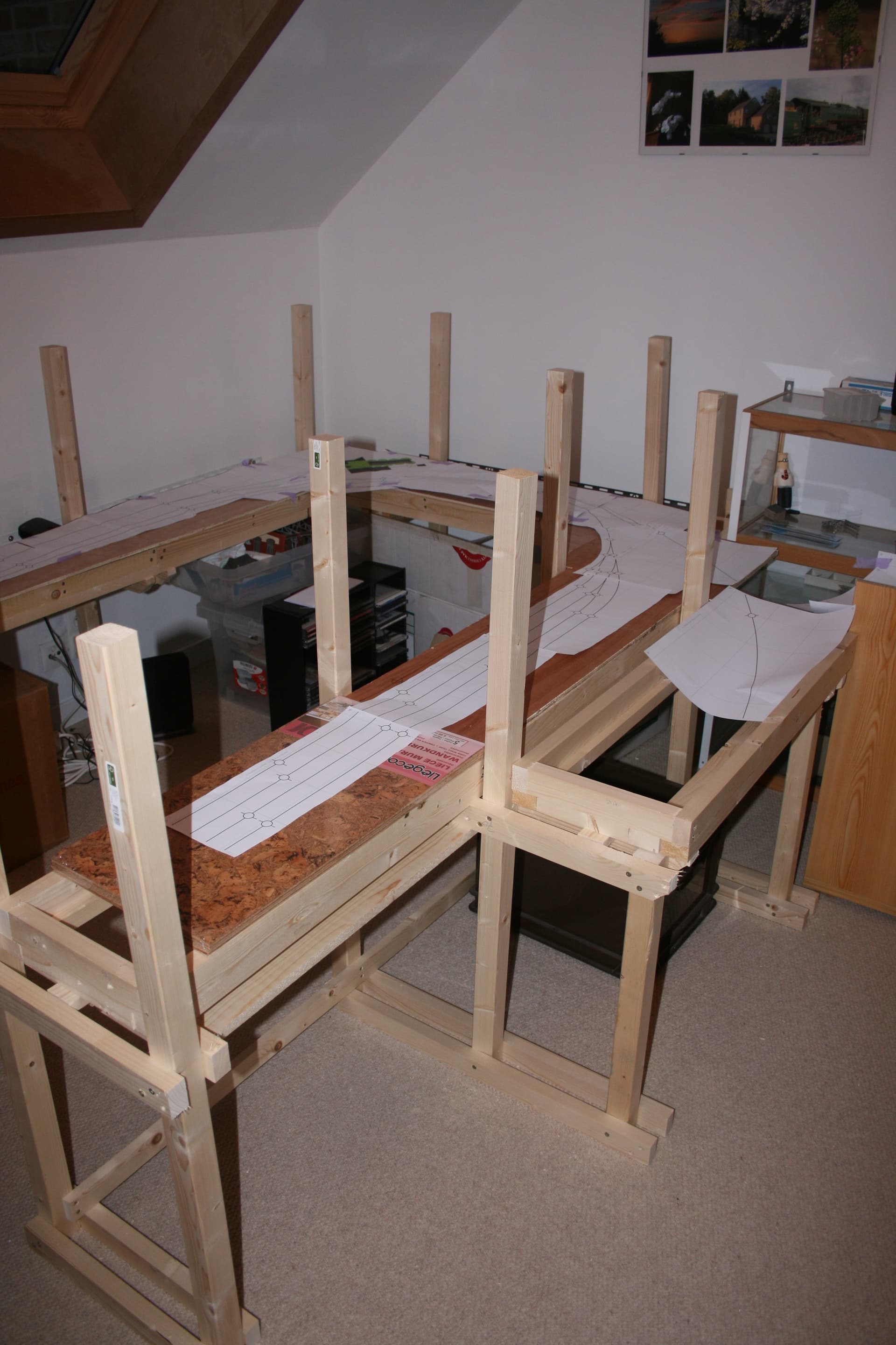 Le plus simple est de faire un cadre solide et de fixer dessus les plateformes de roulement (CP de 10 ou 12 mm) découpées à la scie sauteuse en suivant les plans, 1 ou 2 cm de chaque côté des voies, sur des chandelles mises à bonne hauteur.