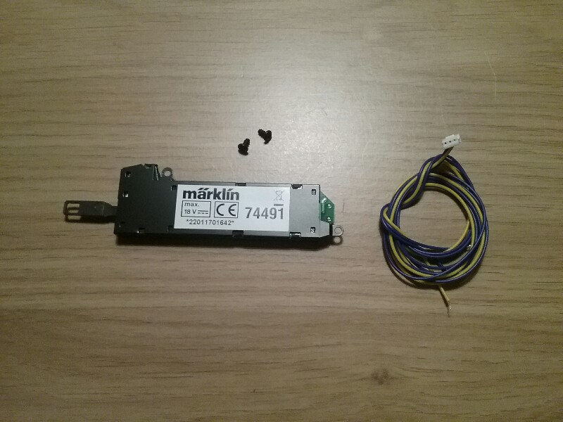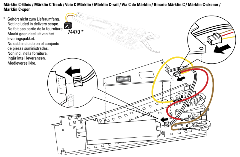 Pour le décodeur, on a le choix entre 2 câbles. Garder celui prévu pour Märklin (jaune-brun-rouge). L’autre est prévu pour la voie Trix.