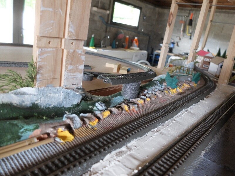 Tout ça pour vous dire qu’il n’y a pas de problème pour un train de prendre la boucle même à vitesse élevée et talonner aussi à bonne vitesse. Je n’ai pas non plus eu de problème pour faire reculer des wagons sur l’enchainement de deux aiguillages triples (dont un est en position tout droit) pour entrer dans la zone de garage.