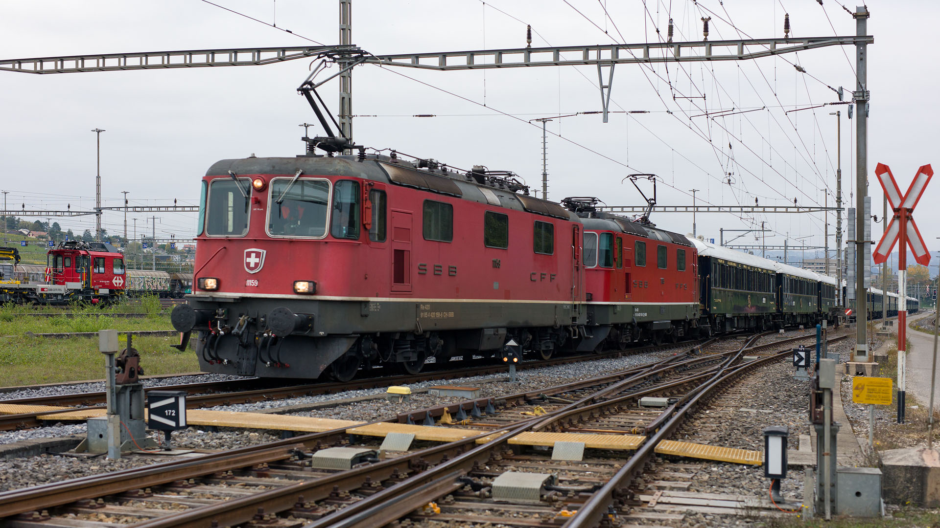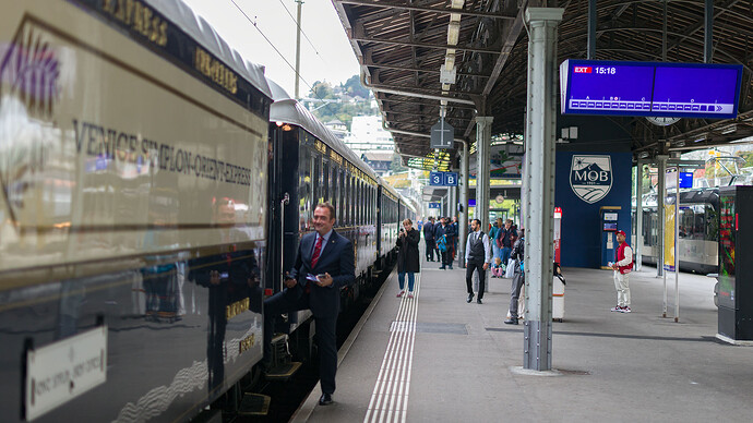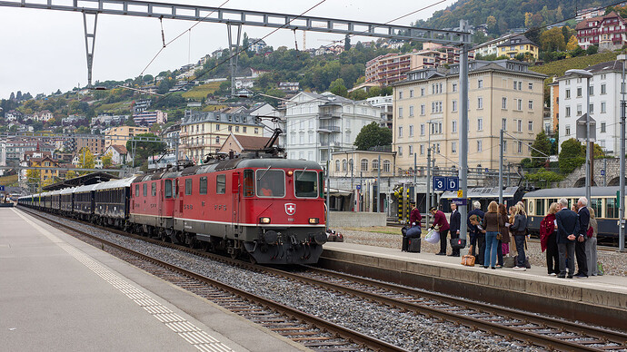 Aujourd’hui la rame bien connue du VSOE a embarqué des passagers VIP à Montreux. Vu que le tronçon Visp-Brig était interrompu en raison de travaux, le convoi est d’abord allé à St-Triphon pour virer les deux Re 4/4 II. Ensuite il a suivi un itinéraire compliqué: St-Triphon-Lausanne-Triage boucle-Lausanne-Bern-Lötschberg (faîte)-Brig-Domodossola (-FS). Vu son poids (> 1’000 t) il n’était pas possible d’acheminer ce train via Chexbres. Quelques photos ci-après et bon dimanche.